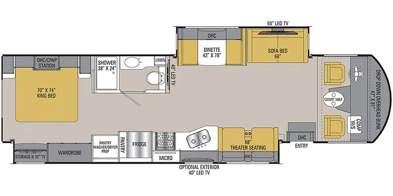 Perfect for a large family! The 35' Fiesta offers a spacious interior with two slide outs to offer even more space once you reach your destination. Equipped with air conditioning and central furnace, you can make sure your traveling and sleeping at a comfortable temperature. Full kitchen inside with refrigerator, freezer, microwave, cook top and oven. Have a big group? Not a problem! This coach can sleep up to seven people with its comfortable queen bed, sofa sleeper, over head bed, and dinette table that converts into a sleeping area perfect for kids! Equipped with a generator and large water and waste tanks! This coach will allow you to sit back and relax in the shade with its large retractable awning.100 miles free per day of rental. After reaching your 100 free miles per day, mileage cost from $0.40 cents to $2.00 per extra. For the onboard generator, you will receive four free hours of use per day of rental. After using your four free hours per day, generator use will cost $4 per hour. No cost for insurance when you add the coach to your personal auto insurance by way of a binder.*100 miles free per day of rental. After reaching your 100 free miles per day, mileage cost from $0.40 cents to $2.00 per extra. For the onboard generator, you will receive four free hours of use per day of rental. After using your four free hours per day, generator use will cost $4 per hour. No cost for insurance when you add the coach to your personal auto insurance by way of a binder.*