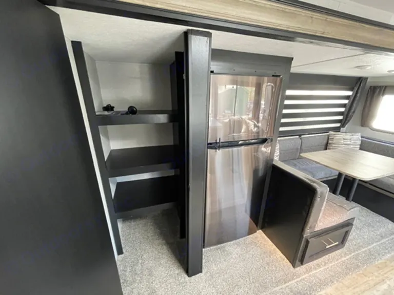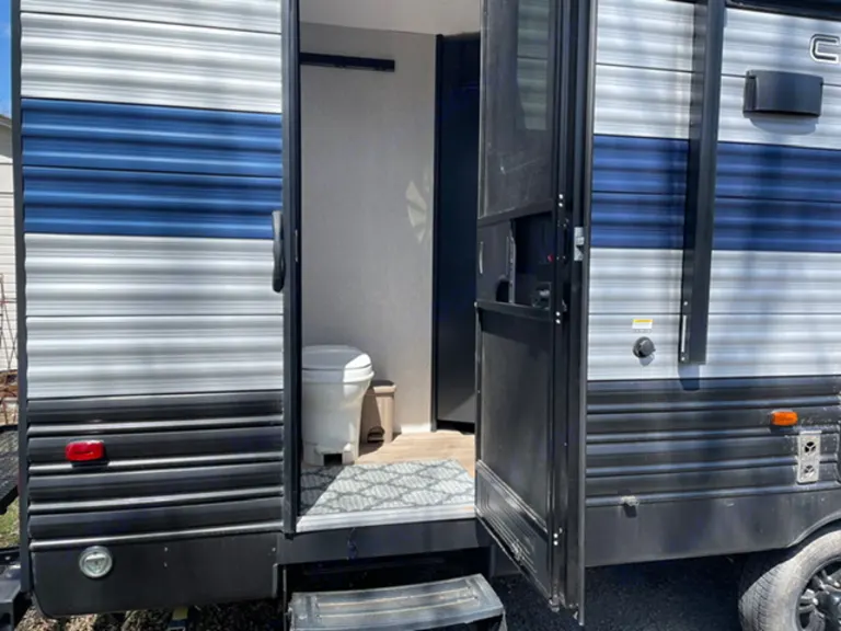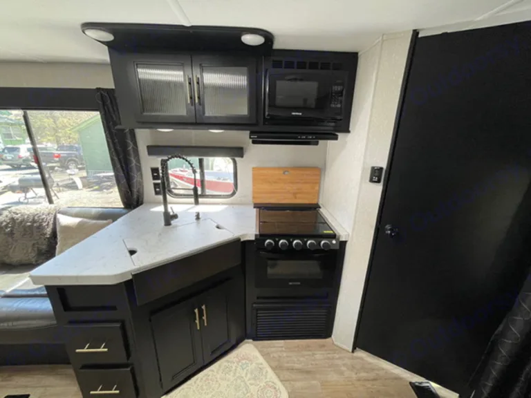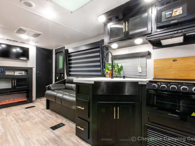 This spacious travel trailer is perfect for families or groups of friends who want to enjoy the great outdoors together. With two adult-sized bunks, a walk-around bed, and two entry doors, there's plenty of room for everyone to spread out and relax.The kitchen is well-equipped with black stainless appliances, a farm sink, and a full-size pantry. There's also a Cherokee Camp Kitchen outside with a refrigerator, a stovetop, hot and cold sprayer, and an icemaker.The living room features cross conversational seating and a big picture window that lets in plenty of natural light. You can relax and watch TV on the 32" LED TV, or play games on the fold-down table.