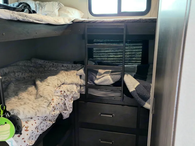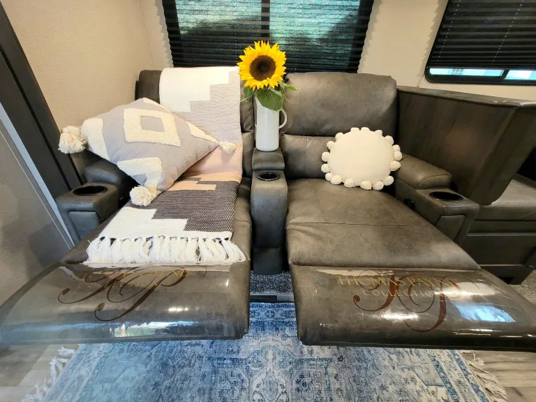 Two (2) Bathrooms!!! This amazing Condo on Wheels #rentmycow is 38ft bumper to bumper and not for the faint of heart, experienced driver is a must and required (delivery available). Has a private entrance master bedroom with queen bed en suite. Second bedroom includes four single bunkbeds with its very own bathroom!!! Features open concept kitchen and living area on a single slide out. Two recliners that fold out for additional sleeping capacities along with a convertible dinette. Outdoor kitchen (includes ice maker and Keurig brewing, 21 foot awning, and speakers with Bluetooth connectivity.#rentmycow is the perfect "driveway" hotel room(s) for holiday and family get togethers!