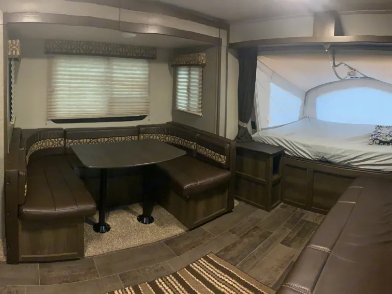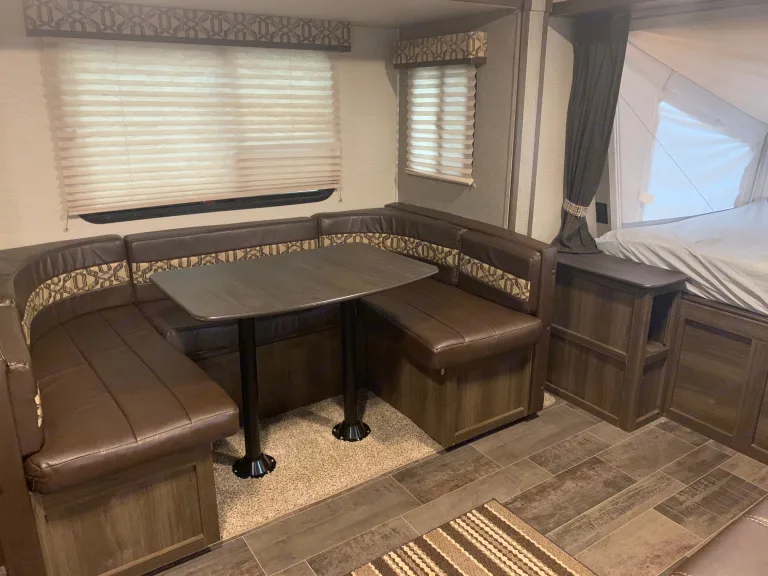 Adjacent to the dinette is a jack-knife sofa that provides seating and additional sleeping space.The camper also has a private full size bathroom with shower/tub/sink/toilet. In the kitchen you will find a very large tub sink and 2 burner propane stove. The kitchen also has a mid-size fridge/freezer.What's included• A few pots and pans