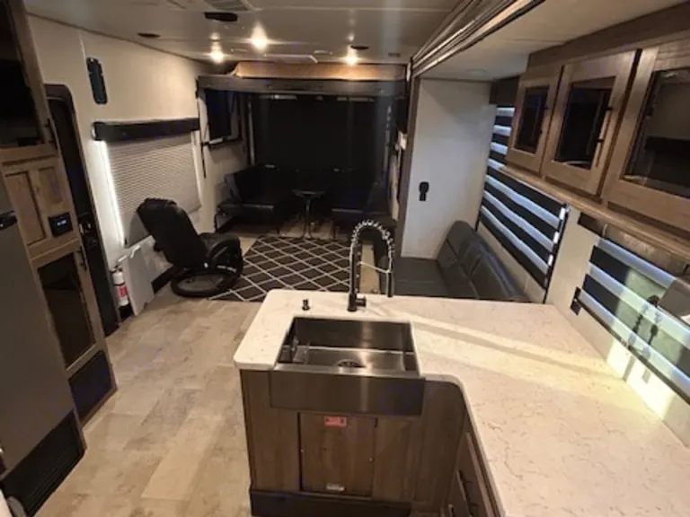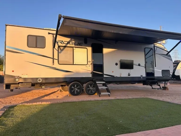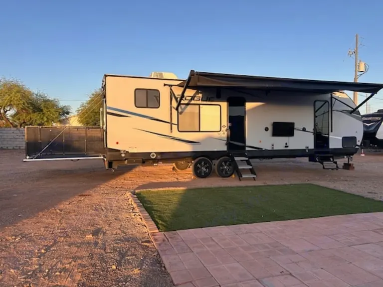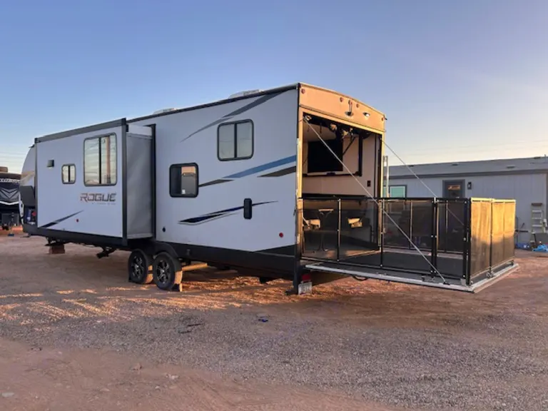 Looking for a toy hauler that’s as adventure-ready as you are? Our 2022 Forest River Vengeance Rogue 29KS delivers the perfect mix of rugged hauling power and residential comfort — ideal for dunes trips, off-grid camping, festivals, or family getaways.This trailer features a massive 15'6" garage that fits virtually any SXS, quad, or dirt bike combo. When unloaded, the garage converts into a flexible lounge or sleeping area with drop-down beds and a sofa bed, comfortably sleeping up to 8 guests.Up front, you'll find a spacious private king bedroom, giving you a quiet, comfortable place to recharge after a day outdoors. The fully equipped kitchen includes a large refrigerator, microwave, cooktop, and sink — perfect for cooking real meals on the road.Two A/C units and 50-amp power keep the whole trailer cool in the Arizona heat, while the onboard generator and oversized tanks make off-grid camping easy. The rear patio with railing adds a great outdoor living space to enjoy sunsets, hang out, or keep the pets contained.We’ve made renting easy — our prep fee includes everything you need: