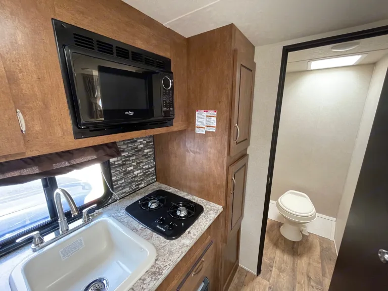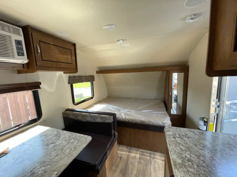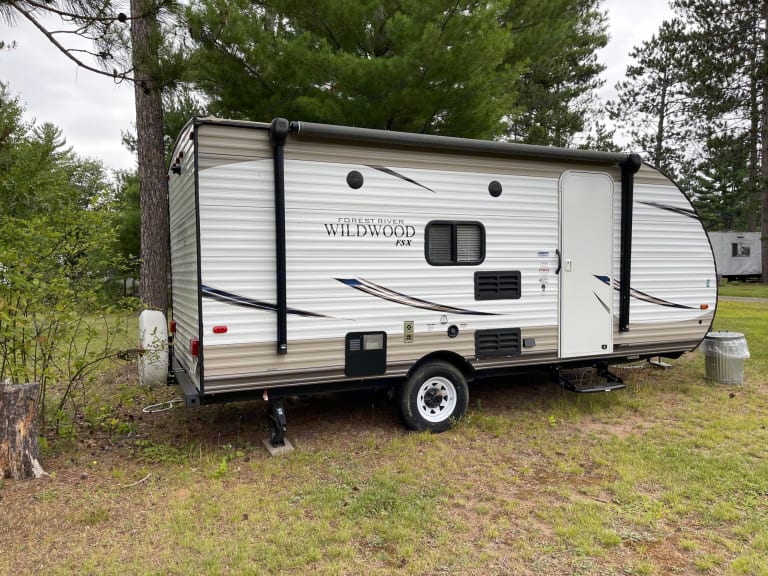 You'll love the automatic awning and the built in sound system (inside and outside) to listen to your vacation playlist while you relax in the great outdoors!Queen bed, bunk bed, tabletop converts to sleeper, tons of storage, propane stove burner, refrigerator, bathroom, shower, solar ready, air conditioning, and much more!This model is light enough to tow with your light truck or SUV, small enough to easily maneuver into any camping spot, yet large enough for the whole family to relax. What's includedIncluded with this rental are fresh linens as well as a Keurig machine for coffee. RecommendationsBring sleeping bags and pillows as they are not provided. Paper cups and plates are a good idea. Other things to noteNo pets allowed.
