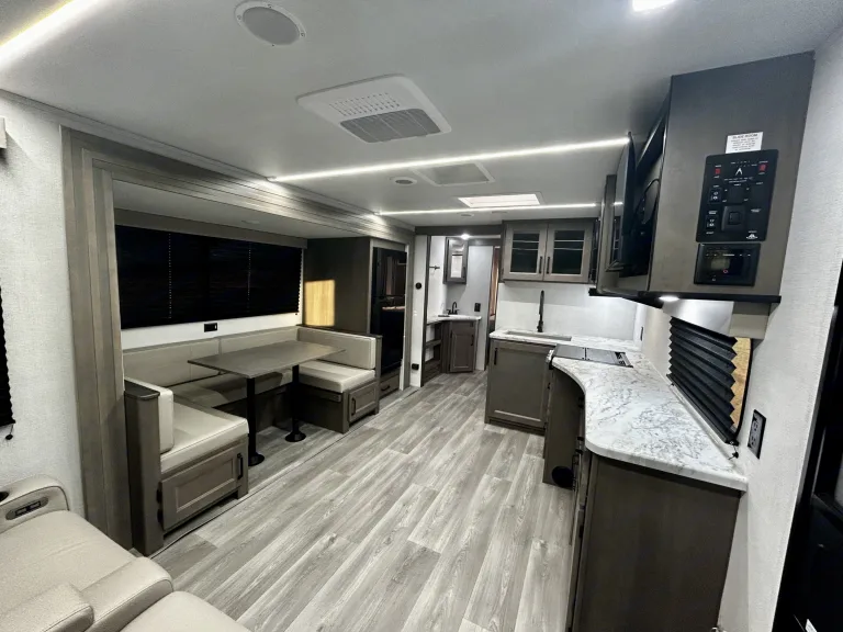 Sit down and enjoy a movie at the end of the night from the U-Shaped dinette or electric recliner couch.