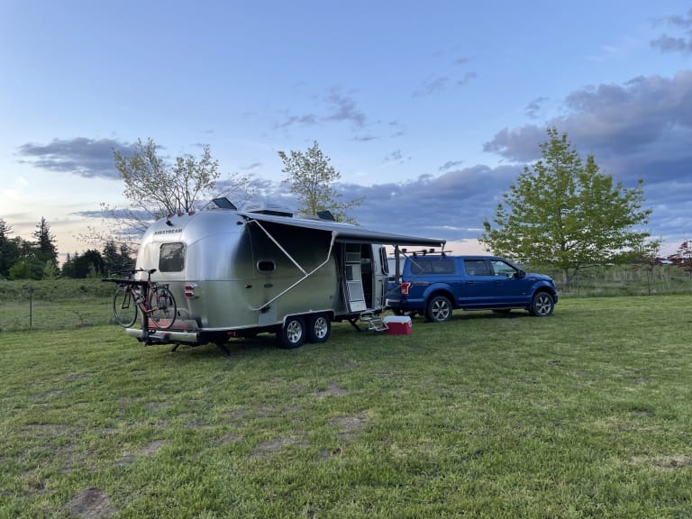 Make our beautiful 23' Airstream your home while on vacation in Washington State. The iconic style of an Airstream makes for a luxurious camping experience. The quality of construction, layout of the interior, and views through the many windows ensure your time spent inside will be as pleasurable as your adventures outside.Driving an unfamiliar travel trailer can be intimidating for many. So let me deliver our Airstream to your campsite and set it up for you. And of course, I'll return at the end of your camping adventure to drive the trailer back home. If you have an appropriate truck of your own, and are experienced driving a trailer, you can take our Airstream on your own.As you enter the trailer, the kitchen is to the left. It has a 3-burner stove and oven (propane), a micro-wave oven (electric), and a refrigerator/freezer (either propane or electric). The kitchen has all the utensils needed for preparing and enjoying great meals!