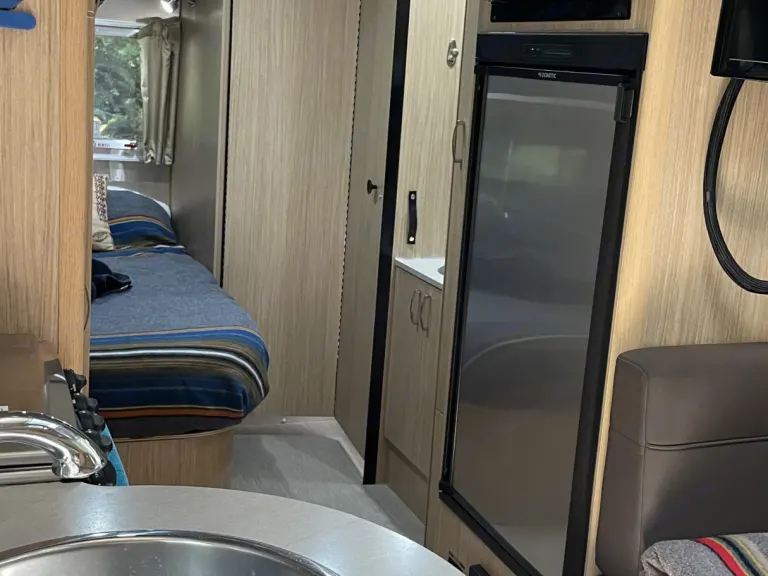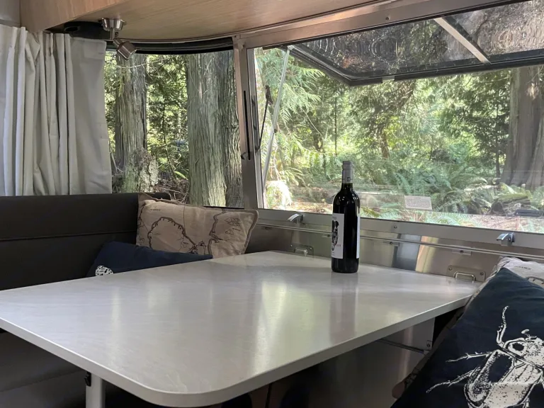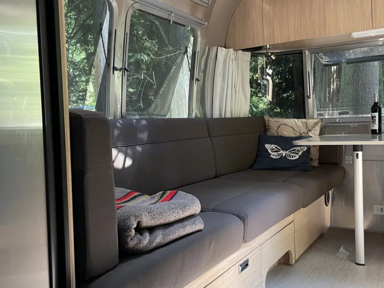 At the end of a long day, sink into the comfort of the full-size bed at the back of the Airstream. The bunk is tucked above, which is a fun space for a child of up to 150 lbs (or for storage). For additional sleeping space, the dinette converts into a bed that can fit 2. And the couch can be also be converted into sleeping space for 1 or 2. While Airstream claims that this model sleeps 7, it really works best for up to 4 people.What's included• We can supply bedding, upon request. Or you can bring your own bedding and/or sleeping bags.