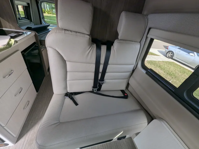 In the living area, you have two swivel cab seats. Comes with a collapsible dinette table and two three-point seat belts in the booth dinette.