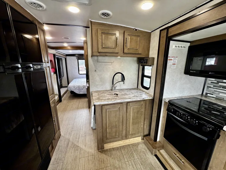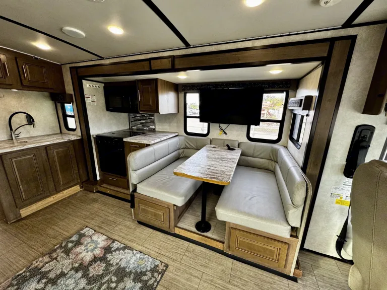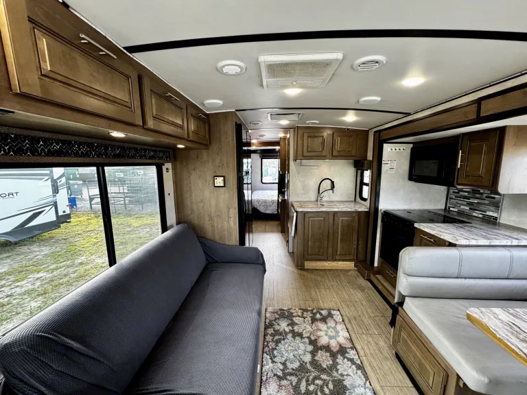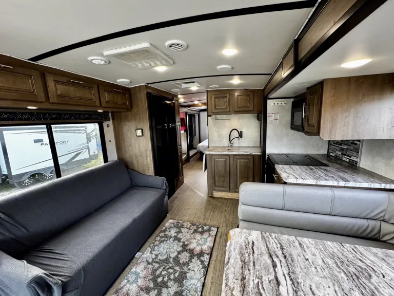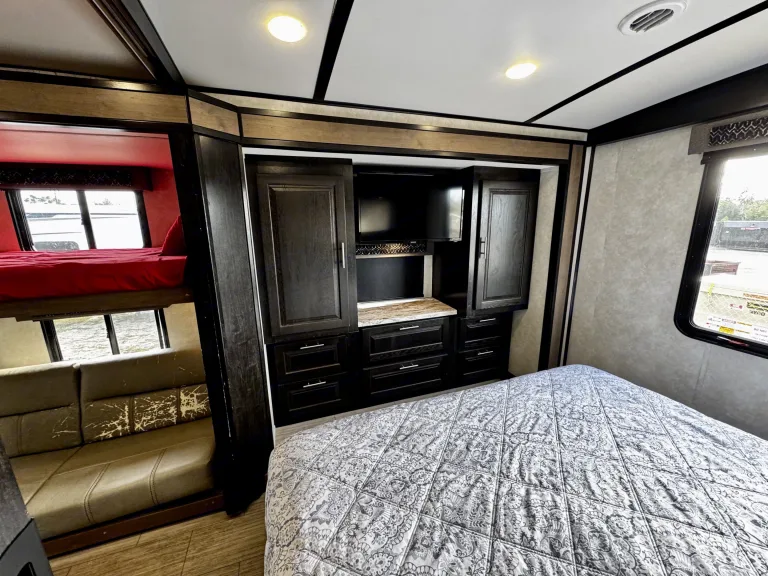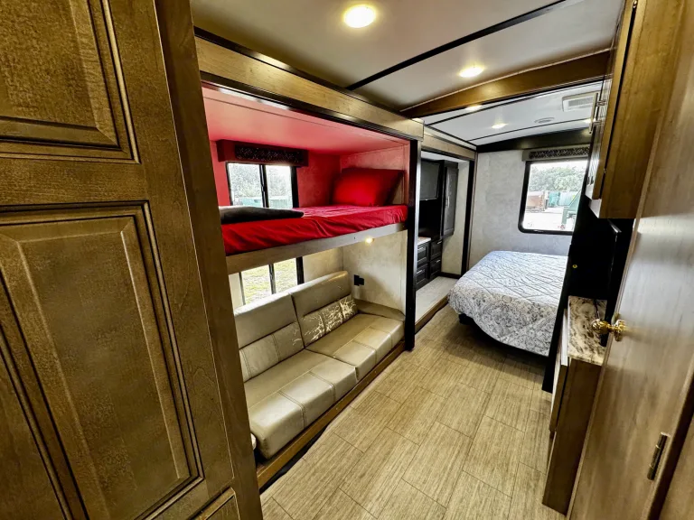 Cozy RV rental interior featuring bunk beds, a sofa, and a comfortable master bedroom area, ideal for family trips.. Forest River FR3 2021