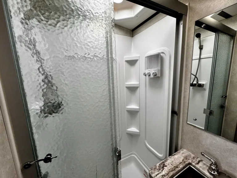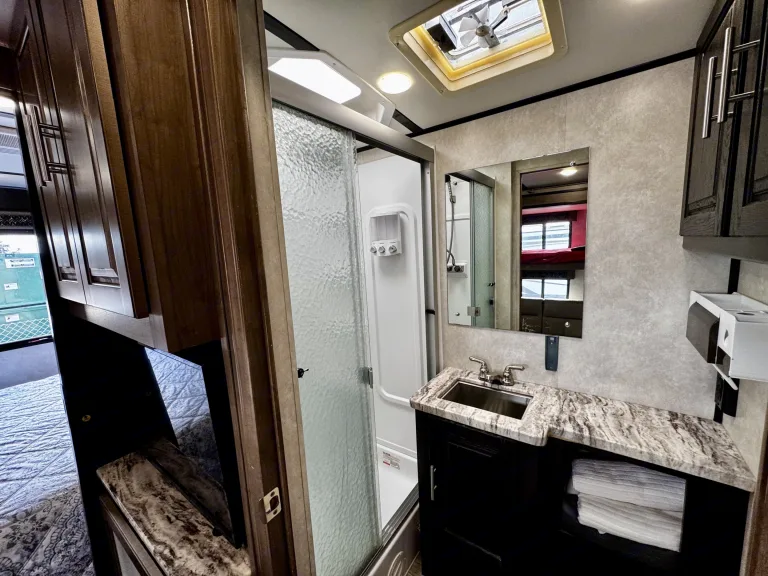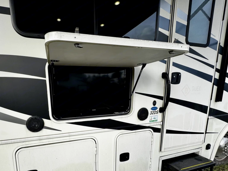 RV rental interior shows a comfortable bedroom, mounted TV, wood cabinetry, and a control panel for modern amenities.. Forest River FR3 2021