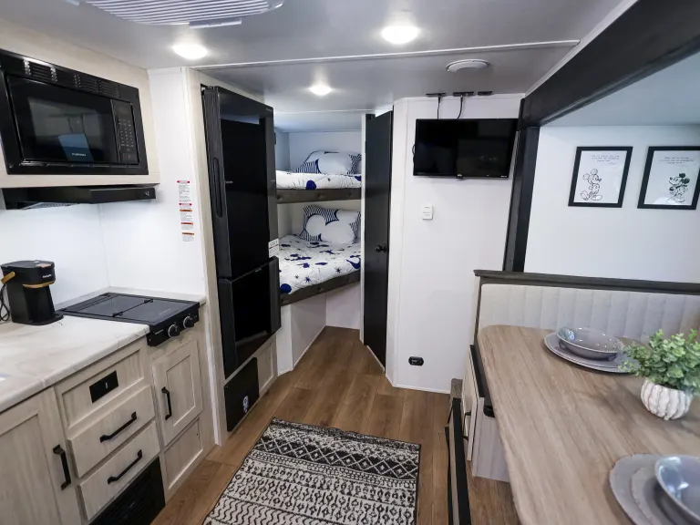 Double-Size Bunks: Perfect for kids or guests, offering comfortable sleeping space for multiple people. Murphy Bed: Versatile 60" x 74" Murphy bed in the front that easily transforms the living space into a bedroom. Exterior Speakers: Enjoy music or entertainment outdoors while relaxing or dining under the awning. 16' Electric Awning: Provides plenty of shade for outdoor dining and relaxation. Interior Highlights: Spacious Sleeping Arrangements: Double-size bunks for the kids or guests, while the Murphy bed up front offers comfort and versatility for the adults. U-Shaped Dinette: Offers a cozy spot to enjoy meals, play games, or simply relax. It also converts into an additional sleeping space if needed. Functional Kitchen: Equipped with a two-burner cooktop, stainless steel microwave, and a residential refrigerator to make meal preparation and storage easy on the road. Private Bathroom: Located in the rear corner, the bathroom includes a toilet and a tub/shower for easy clean-up after outdoor adventures. Exterior and Storage: 16' Electric Awning: Extend your living space outdoors, perfect for dining or relaxing in the shade. Add camping chairs for a complete setup. Optional Mini Kitchen: This unit includes the option for a mini kitchen with a griddle (Included), making outdoor cooking more fun and convenient. Stabilization and Easy Setup: Front and rear stabilizer jacks ensure a steady setup, while the power tongue jack makes leveling a breeze.Luxury and Comfort: Modern Interior Features: The trailer is outfitted with LED ceiling lights, durable Beauflor linoleum flooring for easy clean-up, and a decorative kitchen backsplash for added style. Contemporary Finishes: Enjoy the modern touch of light fixtures, hardware, and bath fixtures that give the interior a sleek look. Well-Organized Kitchen: Includes a divided silverware drawer for efficient storage, keeping everything neat and easy to access.Start your vacation with Escape RV Rental - Bambi!!