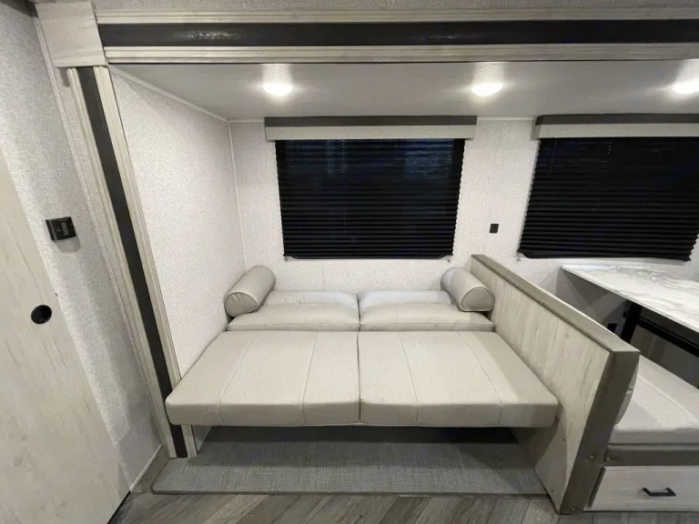 Enjoy your getaway with the whole family in this brand new East to West Della Terra camping trailer! It sleeps 8 comfortably, with 7 individual places to sleep: Double large adult size bunk beds with flip sofa (4 bunks total) with 300 lb capacity ratings; A unique 72" x 80" King "master" bedroom; Jackknife sleeper sofa; and oversized 42" booth dinette which converts to a full size bed. The camper is also equipped with an executive chef kitchen with stainless steel appliances: refrigerator, microwave, stove/oven, and farmhouse sink.