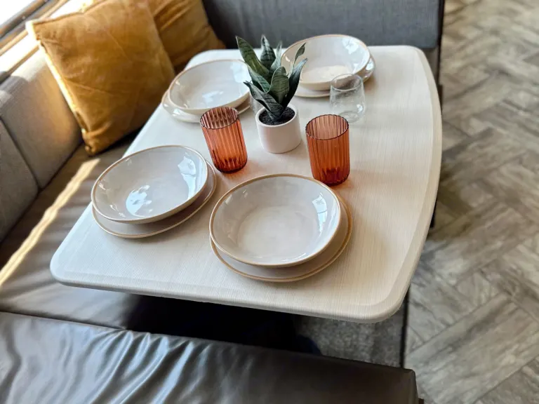 • Sleeping Arrangements: Queen-sized bed, dinette bed conversion, sofa bed conversion, and triple bunk beds.