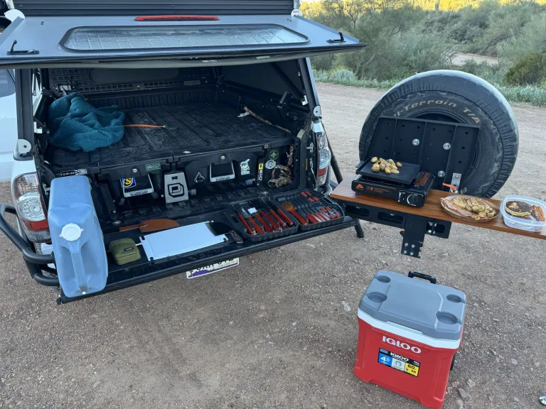 Chef Ready: A full Decked drawer system houses your camp kitchen. Includes a burner stove, pots, pans, utensils, and cutting board—just bring groceries.