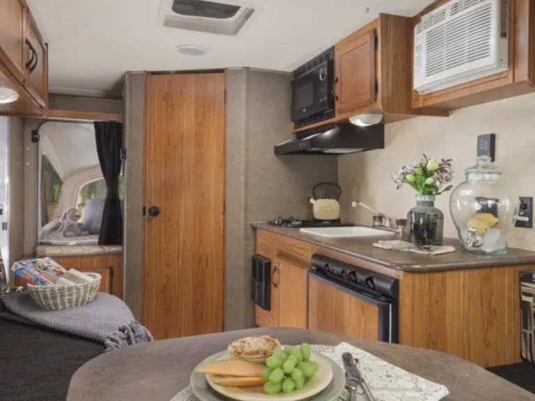 Amazing camper! Sleeps five with a queen, full and twin bed. Has a canopy if you want to have a picnic or cook out. Includes a bathroom with the toilet and shower. Has a kitchen with the stove top, microwave and refrigerator. Also has heating and air.