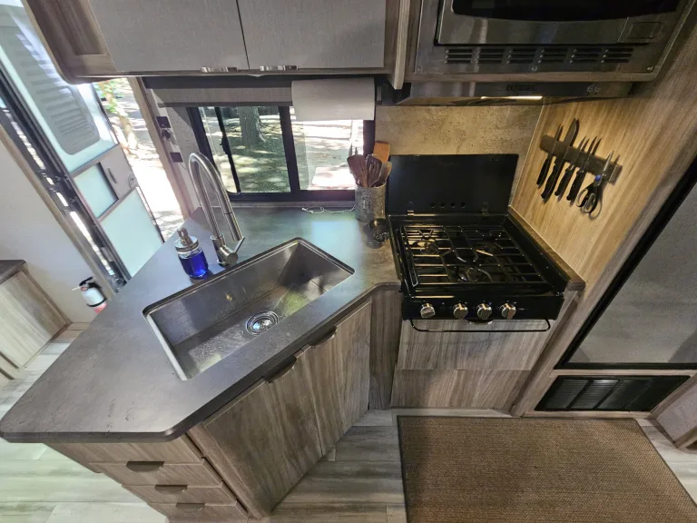 Full-size kitchen sink, 3-burner propane range, and microwave/convection oven
