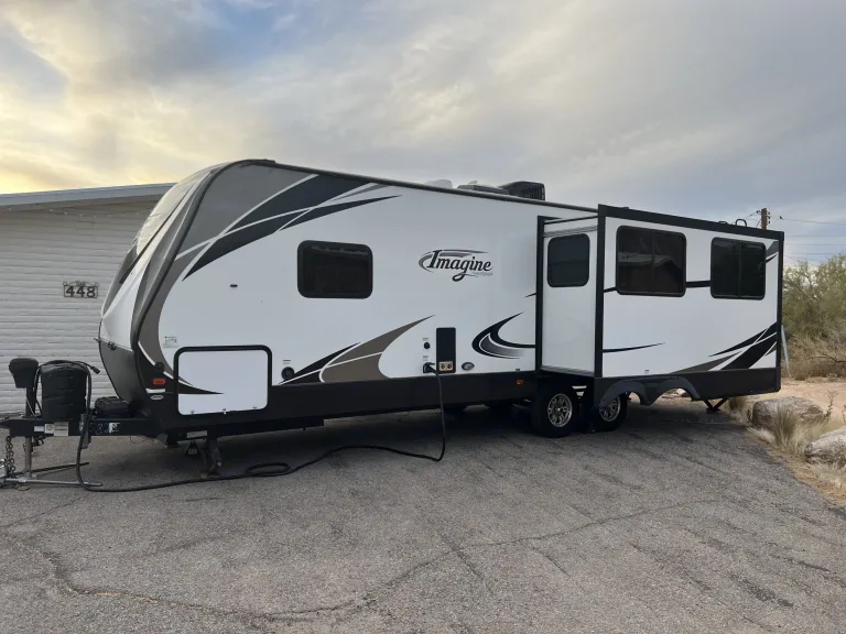 Our like-new 2017 Grand Design Imagine 2670mk Travel Trailer is an easy tow for half-ton pick ups with an 8500 lb dry weight. Featuring two (2) massive slides with a lot of windows, a large kitchen island, stove, oven, microwave, refrigerator/freezer, desk, dinette that seats four and converts into a bed, two super comfortable leather recliners with a heating option AND heated cup holders, hideaway tv, bluetooth stereo with AM/FM Radio, full bath, bedroom with a comfortable queen bed, lots of storage space, 1 AC, 3 reversible fans, outdoor kitchen with mini frig and propane stove, most importantly a bottle opener, ladder to the roof, huge awning with LED lights, and a 10 gallon propane tank — not to forget all of the other tanks.Our trailer is super clean and comes with all the bells and whistles! What's includedCookware, pots, pans, spices, fresh linens for bed and bathroom, 4 folding chairs. Other things to noteWe also have a 4500 watt electric start generator*.
