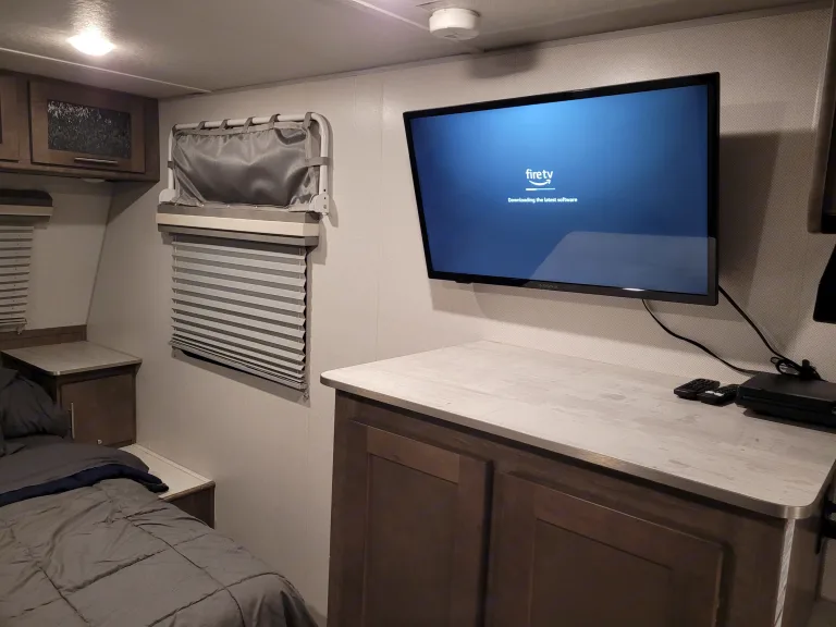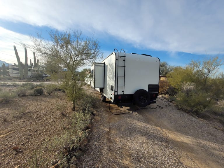 Ready for your next adventure or vacation! This RV trailer is great for first timers and experienced Rv'ers alike. Easy to drive and maneuver. The pop out adds extra space for comfort. Sleeps up to 5 with a queen bed, sleep couch, and disc-o-bed bunk sleep cot. Very cozy and updated. Fully stocked with linens, dishes, and cookware. Also camping chairs included as well as other small amenities perfect for camping.What's included Sleeps up to 5 with a queen bed, sleep couch, and disc-o-bed bunk sleep cot. Very cozy and updated. Fully stocked with linens, dishes, and cookware. Also camping chairs included as well as other small amenities perfect for camping.