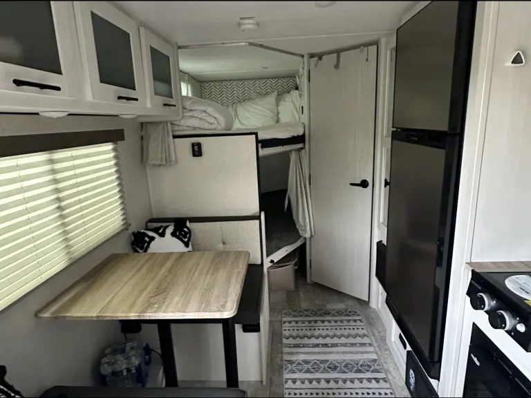 This charming and cozy travel trailer is your ticket to unforgettable getaways! Designed with families in mind, it features a stylish modern interior and all the comforts of home. Enjoy the convenience of included camping chairs, bed linens, kitchen essentials, and fresh towels—just pack your bags and hit the road! Whether you're exploring the great outdoors or relaxing at a campsite, this trailer has everything you need for a comfortable and fun-filled escape.