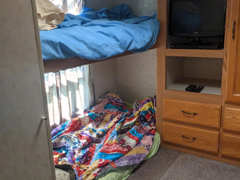 This camper sleeps 10: 2 sets of bunk beds in the rear, queen master in the front, sleeper sofa, and table that converts to a bed. There’s a full kitchen and bathroom. As well as plenty of supplies for those of you who’ve never camped. Just bring your own linens, towels, and pillows.
