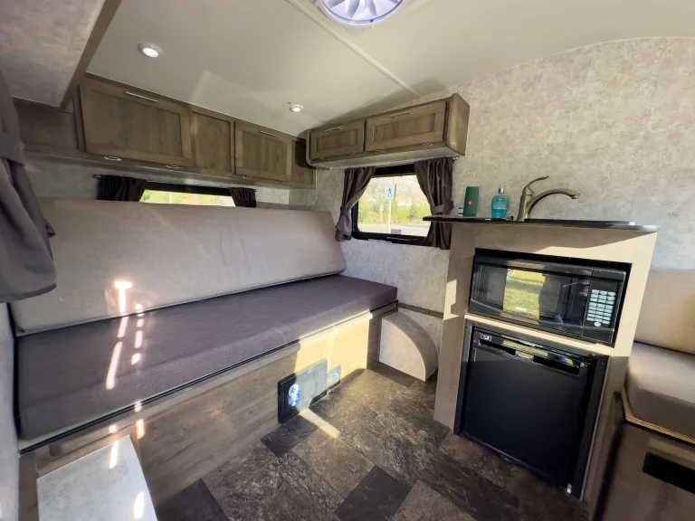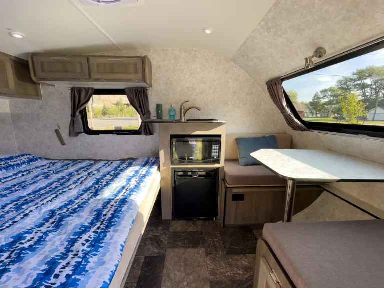 Coming in under 1,500lbs loaded, 12V can be towed by most vehicles! It has a spacious king-sized bed that doubles as a couch and a two-person dinette that can turn into a small bed.12V is adventure-ready! Speaking of adventure-ready, 12V can handle boondocking like a champ as it has solar panels on the roof that keep the lithium battery charged up. With a shady canopy, you’ll be able to enjoy the great outdoors!I ask that you care for the trailer and gear as if it was your own. I am happy to answer any questions you have and we look forward to sending you on an adventure with little 12VBasic Info: 7-pin Connector, 2" receiver. Dual induction cooktop, small fridge, basic cooking and cleaning items, awning, and fully stocked with the basics (flashlights, headlamps, USB-C and Lightning charging cables, 2 camp chairs).Rental Rules: I ask that you drive with care and treat 12V as if it was your own. I simply ask that you treat it with kindness, have fun, enjoy the outdoors, and bring it back in the same condition as when you took it. No smoking or cooking inside. Please put everything away clean and dry (paddle boards, utensils, pots/pans, cups, plates, etc…)