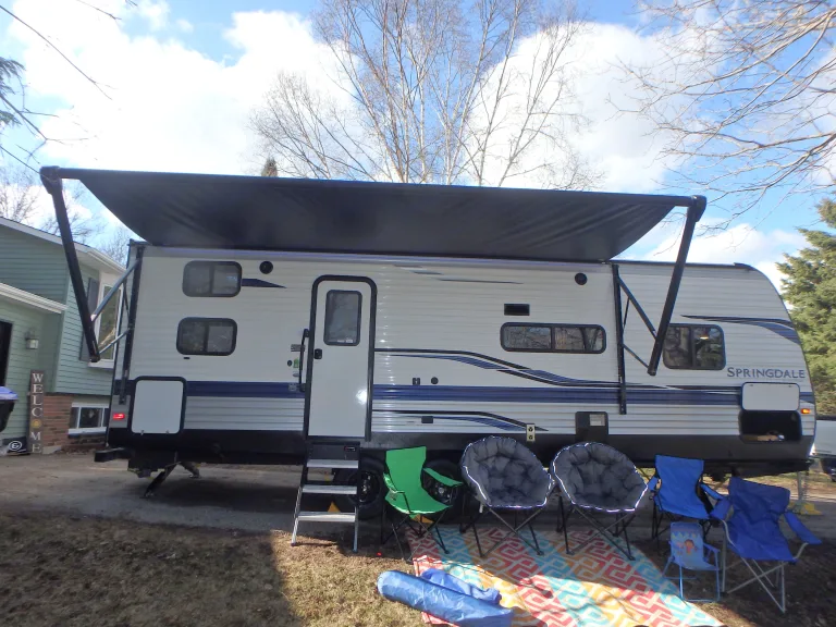 Paradise to go! Bought Brand New May 2022! Extremely clean, great layout for family or couples!A large bedroom area at the back, bunk beds, and a large kitchenette that folds down into a bed. A large number of windows, great natural lighting, a large full-sized fridge, 3 element gas stove, gas oven, microwave, multiple outlets, built-in Bluetooth stereo, AC, heat, and multiple USB charger holes. The trailer is perfect for rainy day games (Which are stocked) or watching a movie on the provided T.V and DVDs! Bathroom with toilet, shower, and sink. Power awning, a power jack, power stabilizing legs, sideways slide out, outside shower, outside fridge - make setting this beauty up simple and quick! A rooftop solar panel makes off-grid camping easier (will need a generator less).It comes fully stocked with anything you would want/need. Nice dishes, cups, travel coffee mugs, toaster, flat griddle, coffee maker, pots and pans, kettle, cutting board, utensils, serving trays. Board games, DVDs, CDs, books, 5 camping chairs, 1 child chair, ring toss, travel beach shelter, outdoor rug, outdoor clothesline, portable camping stove (for outdoor cooking), flashlights, paper towel, toilet paper, beach towels, and more!*** We only offer delivery and pick-up. We do not allow renters to transport the RV ****** No smoking in the trailer ***What's includedA large bedroom area at the back, bunk beds, and a large kitchenette that folds down into a bed. A large number of windows, great natural lighting, a large full-sized fridge, 3 element gas stove, gas oven, microwave, multiple outlets, built-in Bluetooth stereo, AC, heat, and multiple USB charger holes. The trailer is perfect for rainy day games (Which are stocked) or watching a movie on the provided T.V and DVDs! Bathroom with toilet, shower, and sink. Power awning, a power jack, power stabilizing legs, sideways slide out, outside shower, outside fridge - make setting this beauty up simple and quick! A rooftop solar panel makes off-grid camping easier (will need a generator less).It comes fully stocked with anything you would want/need. Nice dishes, cups, travel coffee mugs, toaster, flat griddle, coffee maker, pots and pans, kettle, cutting board, utensils, serving trays. Board games, DVDs, CDs, books, 5 camping chairs, 1 child chair, ring toss, travel beach shelter, outdoor rug, outdoor clothesline, portable camping stove (for outdoor cooking), flashlights, paper towel, toilet paper, beach towels, and more!