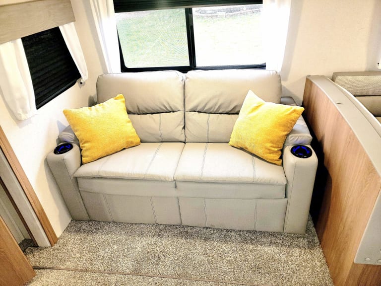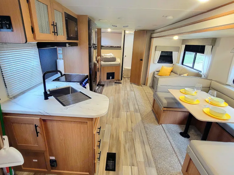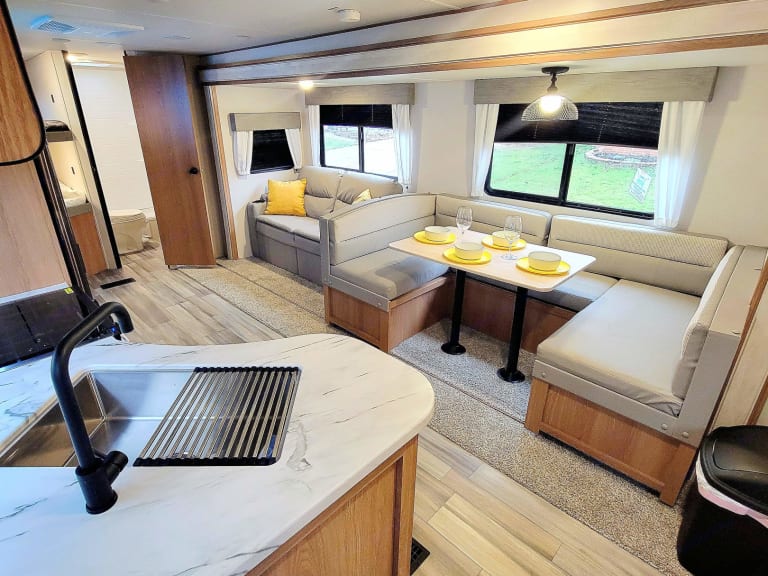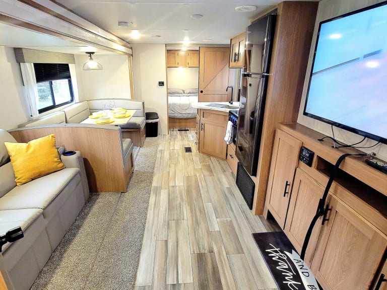 We provide everything you need for a successful camping trip, from pots, pans, silverware, cups, bowls, plates, and cooking utensils to marshmallow sticks, a deck of cards, shower towels, and even a Keurig for your morning coffee. We also provide paper towels and toilet paper, and the beds come with their own blankets and pillows that are washed after every stay. If you prefer to bring your own comforters, we will remove the ones we provide.Our camper is equipped with a backup camera to ensure your comfort when backing into your campsite. We provide a detailed walkthrough upon arrival and are available to answer any questions throughout your stay. You are welcome to record our walkthrough for future reference.