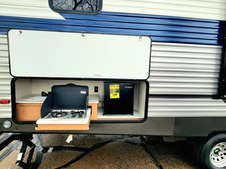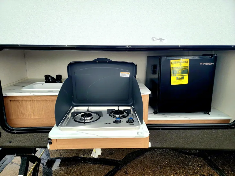 Our 2022 Prime Time Avenger camper is designed to comfortably sleep up to 10 individuals, making it perfect for families and friends who want to create unforgettable memories. It features a private bedroom with a queen-sized bed and a double bunk bed, along with a pull-out bed and a queen-sized table bed. Additionally, it has a fully equipped kitchen that includes a stove with an oven and three burners, a microwave, and a full-sized refrigerator. For those who prefer to cook outdoors, there is a two-burner stove, mini-fridge, and sink in the outside kitchen.