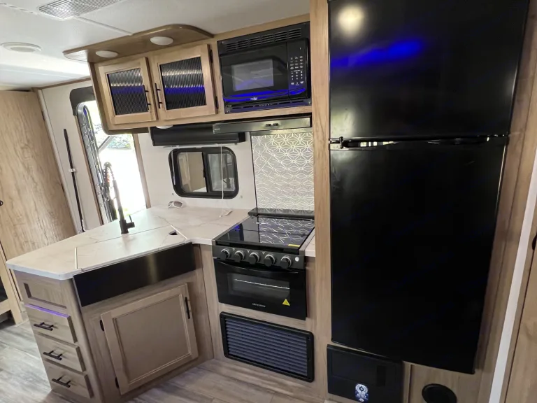 Brand New 2023 DBH Alpha Wolf double bunk house can sleep up to 6 people Possibly more with smaller children. Has outdoor fridge, ice maker, outdoor gas stove top, and shower. On demand water heater so you never have to worry about running out of hot water! Separate washroom entrance to avoid tracking dirt and grime through the main living area. A TV for those rainy days. Power stabilizer jacks. Gas range oven and stove top, microwave. Complete with 100W solar panels with a 12V fridge, and most primary functions will work off the solar panels for boondocking (Water, fridge, and lights). Outdoor and indoor speakers bluetooh to your phone with outdoor and indoor zones you can control through the app. Also has an app to control most functions like awning, slide, water pump, indoor and outdoor lights. This trailer has everything you will need to make the most out of those family getaways, or a relaxing weekend away with friends.Can be towed with a half ton pick up truck or SUV, comes with weight distribution hitch and wireless brake controller when towing. Some other hosts charge extra for these items, but we think they are Essential want to make sure you have the absolute best experience possible and arrive at your destination safely so we include the "little things" in our listing price.What's includedKeurig coffee maker - Can also make hot chocolate for the kids - Bring the Keurig cups of your choosing.