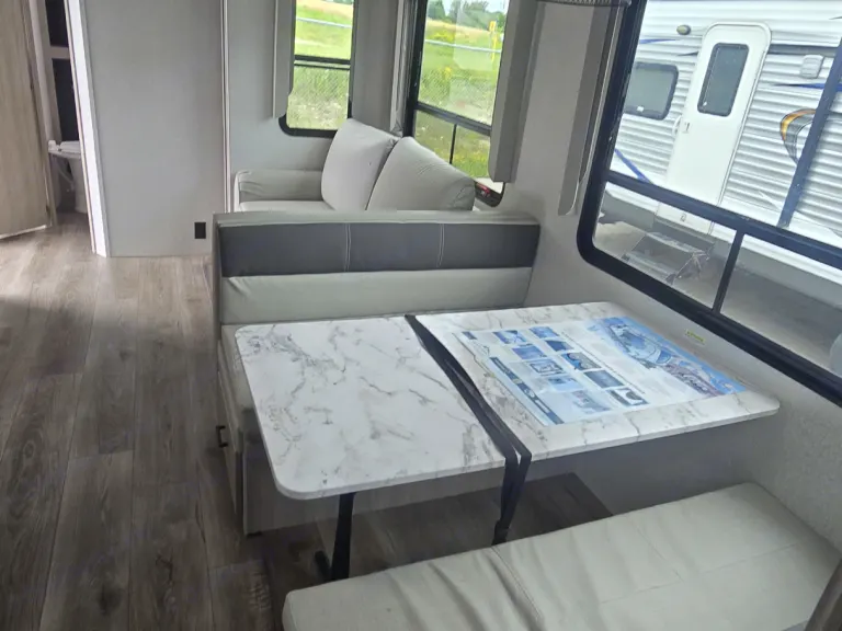 - Ample Storage: Under bed storage, pullout storage drawers under the dinette, and pass-through storage with slam baggage doors.