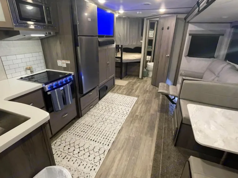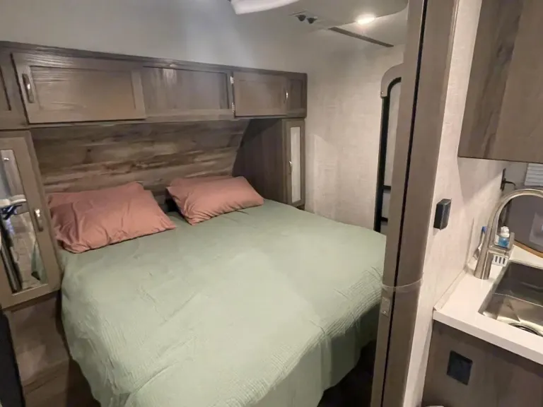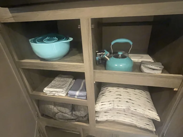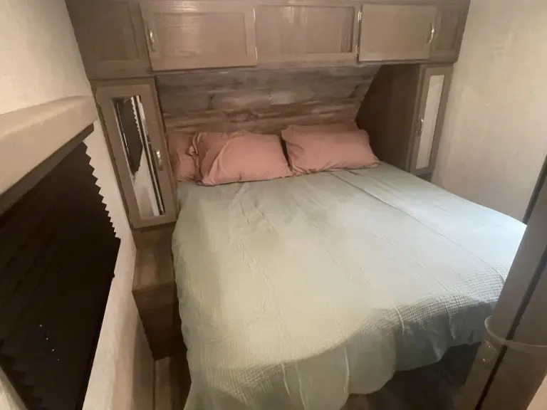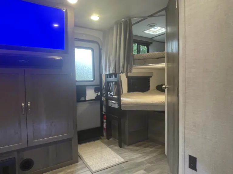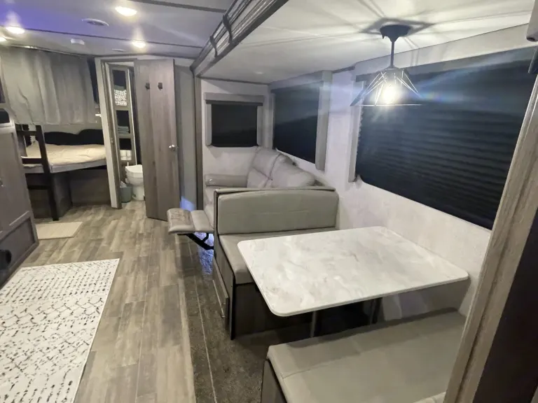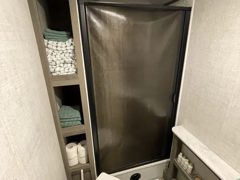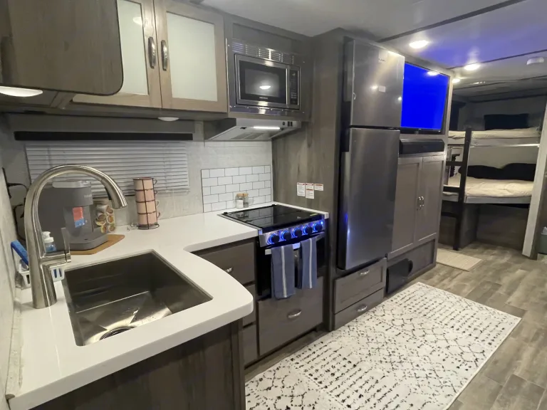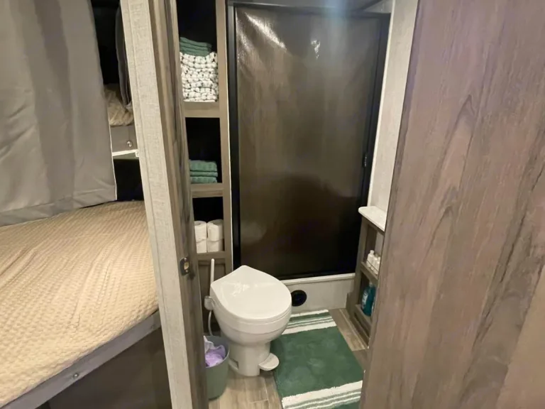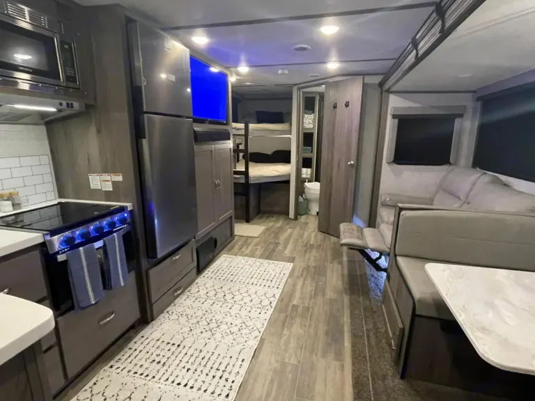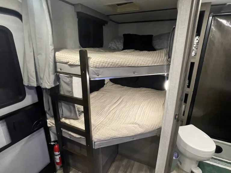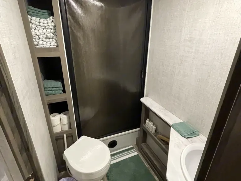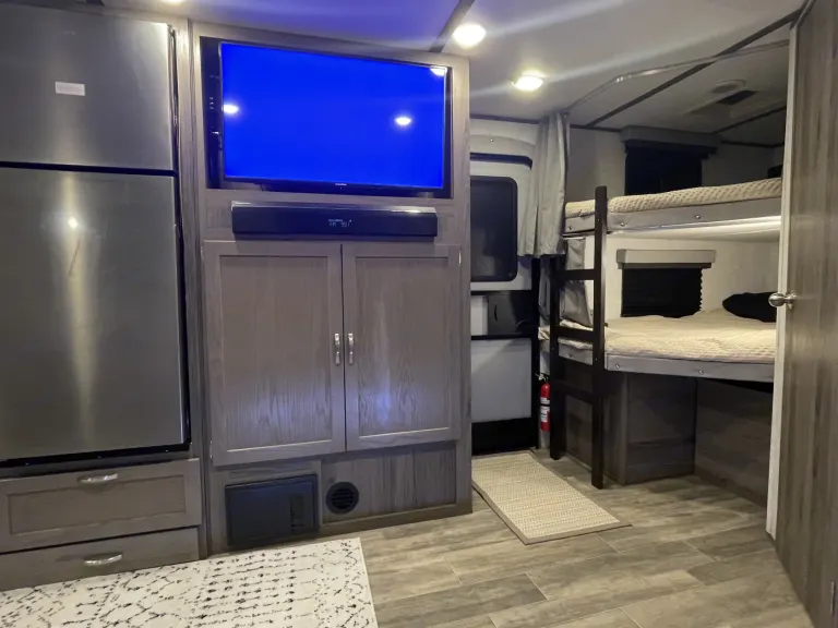 RV is stocked with everything you need for cooking, bedding, bathing (except some personal hygiene items), Keurig coffee maker, Turkish or bamboo towels, nice quality cookware, utensils, dishes, knives, and many extras, by request, like an air fryer, instapot, snow cone machine, blender, margarita machine, jand many other options available to add. Just ask! Very nice shower with sliding door for complete privacy. It has a huge pantry, shoe storage and even a drawer for pets water bowl built in! Indoor sound bar, full size upgraded sink faucet, appliances still have plastic on them! We just bought this RV. It’s like new!Family-friendly bunkhouse with everything you need for an stress-free trip!
