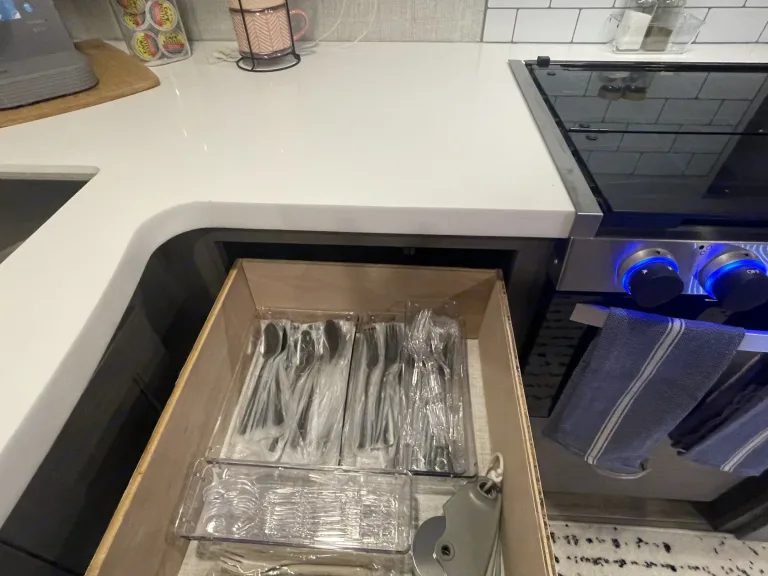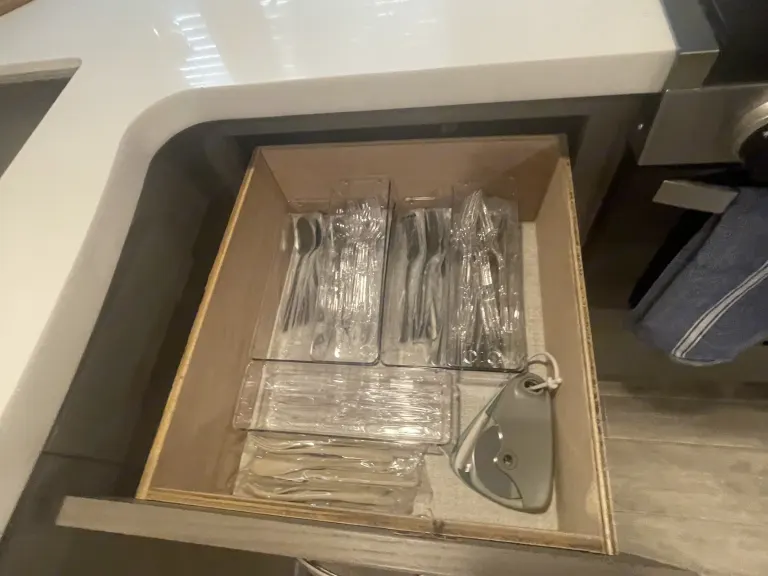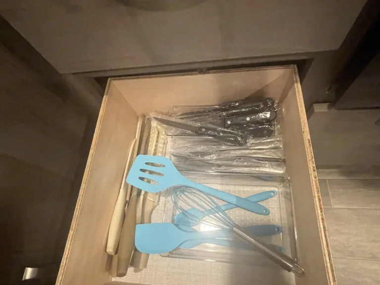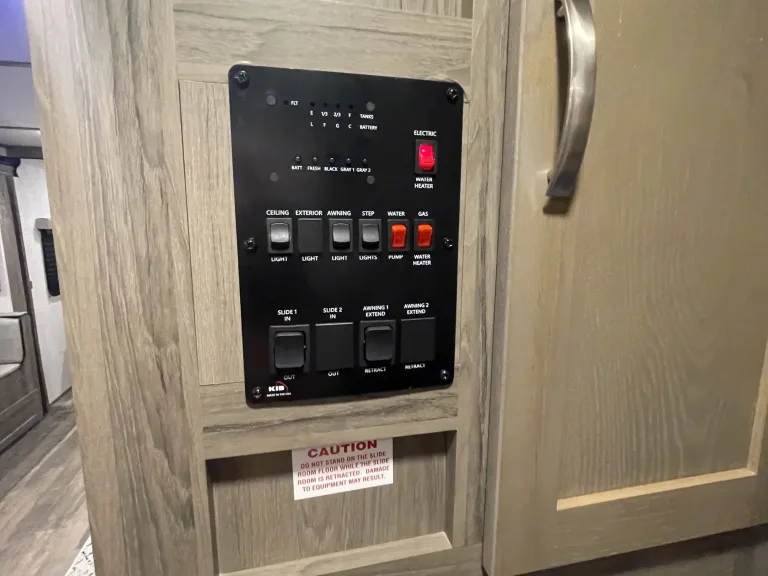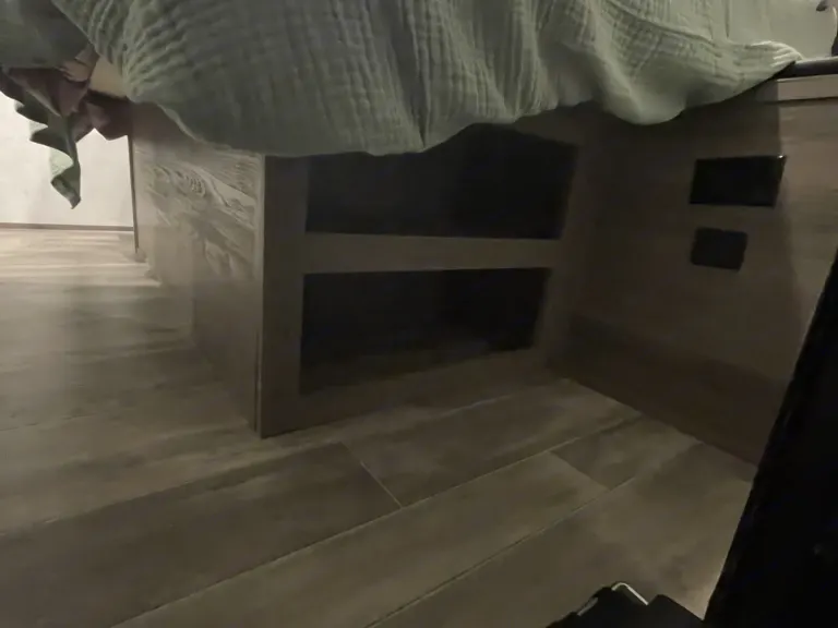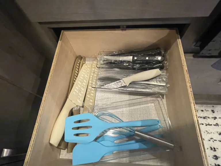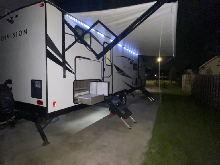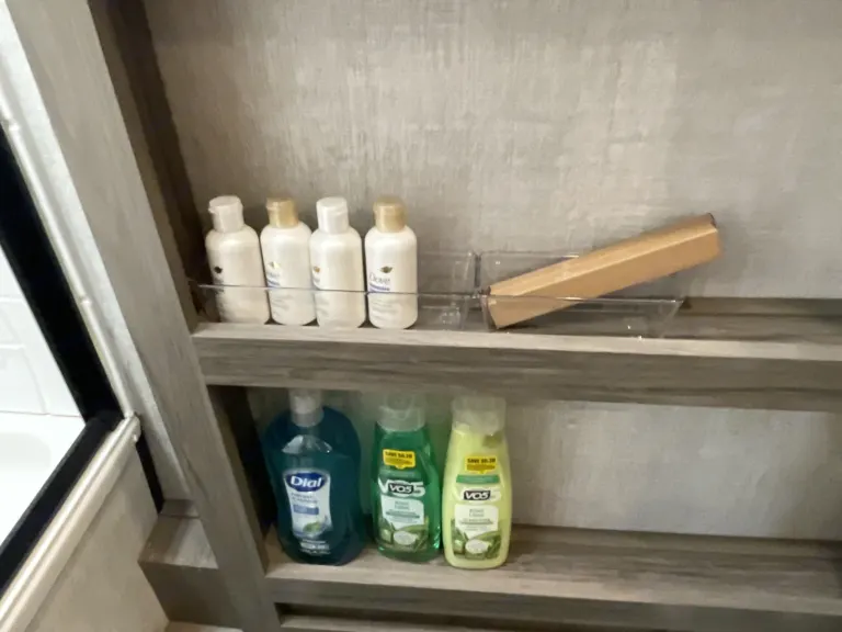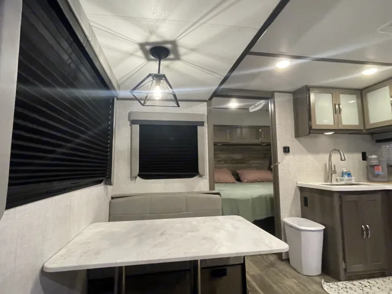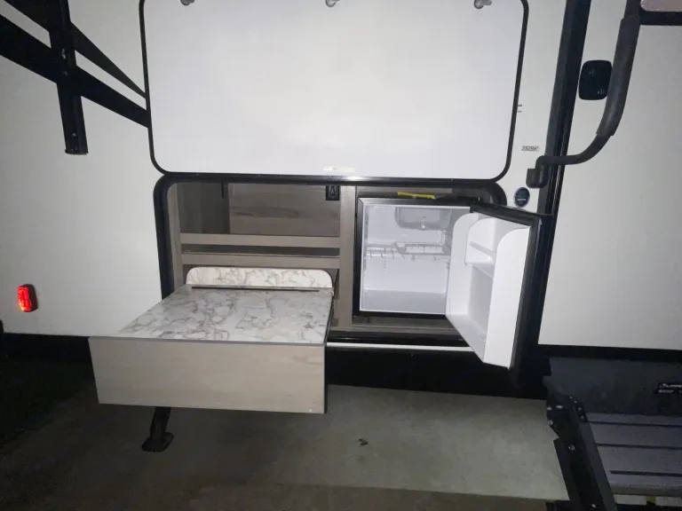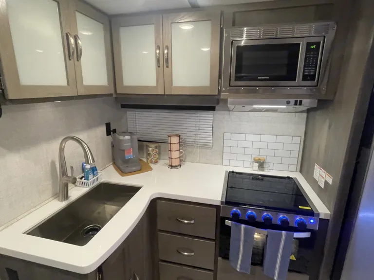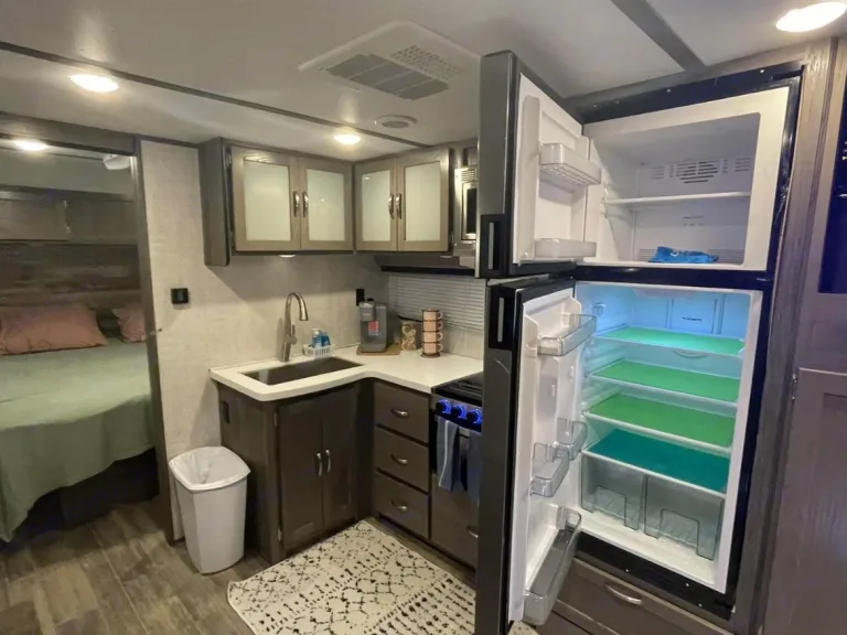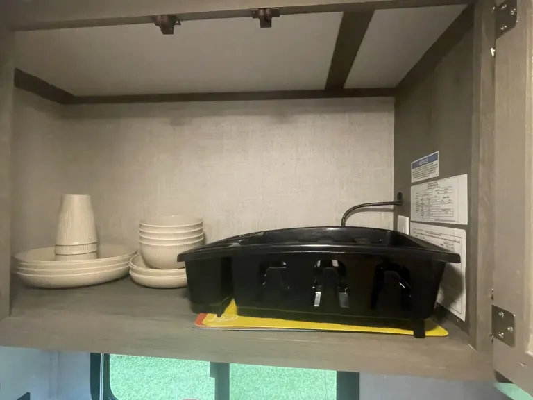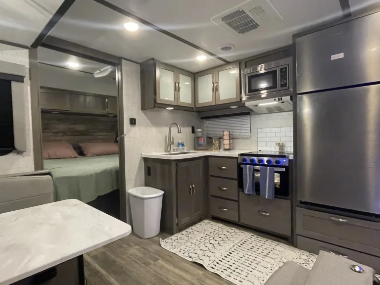 RV is stocked with everything you need for cooking, bedding, bathing (except some personal hygiene items), Keurig coffee maker, Turkish or bamboo towels, nice quality cookware, utensils, dishes, knives, and many extras, by request, like an air fryer, instapot, snow cone machine, blender, margarita machine, jand many other options available to add. Just ask! Very nice shower with sliding door for complete privacy. It has a huge pantry, shoe storage and even a drawer for pets water bowl built in! Indoor sound bar, full size upgraded sink faucet, appliances still have plastic on them! We just bought this RV. It’s like new!Family-friendly bunkhouse with everything you need for an stress-free trip!