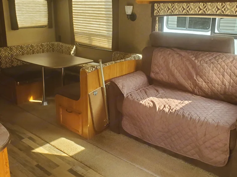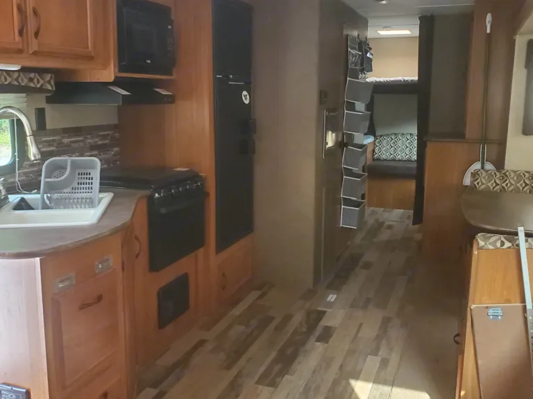 Enjoy your next camping adventure in our spacious travel trailer. With 3 bunks, a queen master, pull out sofa, and convertible dinette, you can sleep up to 9 people. Lots of storage inside for your getaway gear. Enjoy meals in the U shaped dinette designed to fit the whole family. The master bedroom has a standard queen updated mattress. Of course, camping wouldn't be the same without your furry friends so our rig is pet friendly. We will walk you through all you need to know before your trip so you can relax and enjoy the great outdoors. What's includedFitted and flat sheet on all bunks and master
