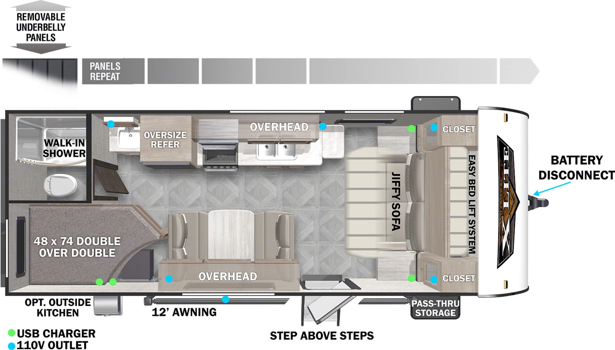 You'll keep the camping complaints to a minimum with the heat/air, Walk in shower, Electric awning, and outdoor speakers. Not to mention you can divide and conquer at dinner time thanks to the outdoor griddle top grill and mini fridge.