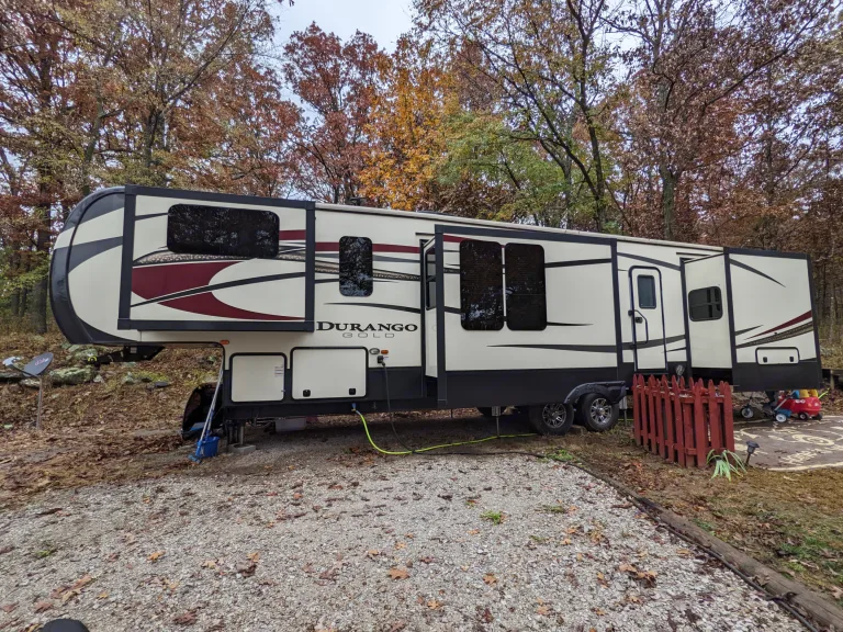 The ever popular front living 5th wheel, with SOO Much Room! This RV setup will allow your family & friends to have a camping experience you will never forget. This is an awesome and spacious RV with 5 slide outs, large upper living area with fireplace, TV, two recliners and two pull out couches, full kitchen with an 18 cu ft residential fridge. Master bedroom has king size bed, sliding door, two separate AC and tons of storage.Outdoor TV & mini fridge to watch the game outside under the awning!What's includedBasic Package comes with: