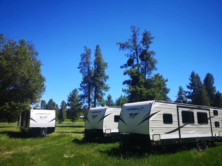 This camper sleeps up to 8 with a queen bed, full bunks, and a sofa and dinette that each converts into a good-for-children bed. The camper has a power awning with outdoor LED lights, inside and outside speakers, a Bluetooth ready radio, central vacuum, as well as a tiny tub for shower! You will find the RV fully stocked with standard items you will need for cooking.We offer delivery & set up in any campsites around West Yellowstone Montana. Please consult with the owner.