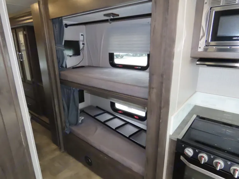 RV rental interior features modern wood-grain bunk beds with privacy curtains, small windows, a mounted TV, and a compact kitchen with stove/microwave.. Coachmen PURSUIT 31BH 2023