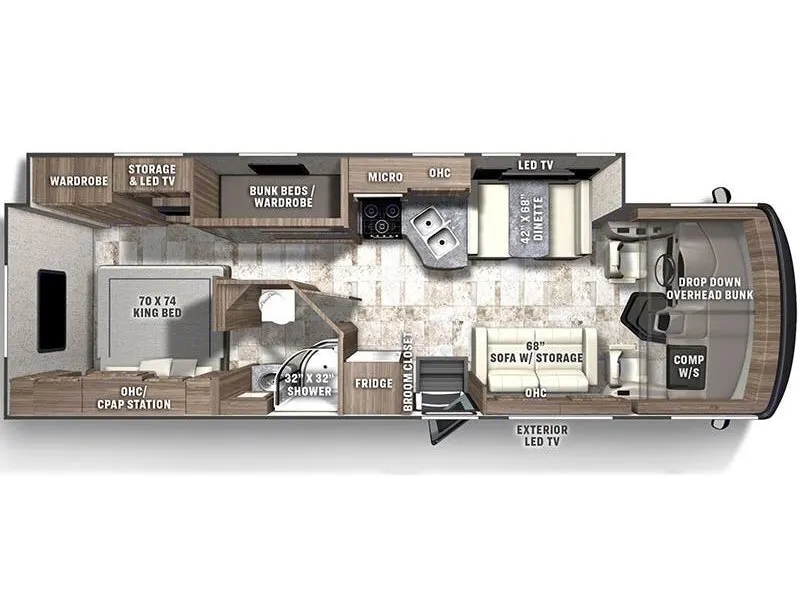 • Unleash adventure with this family-ready Class A, offering true off-grid freedom.
