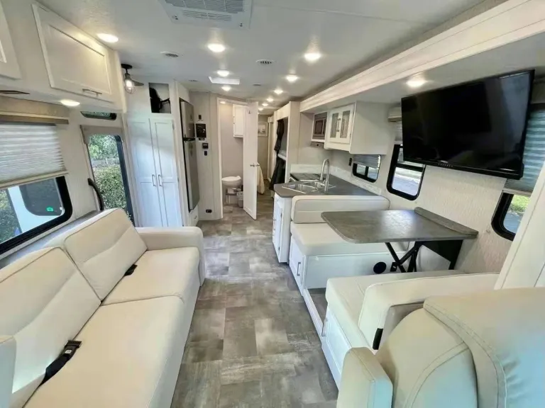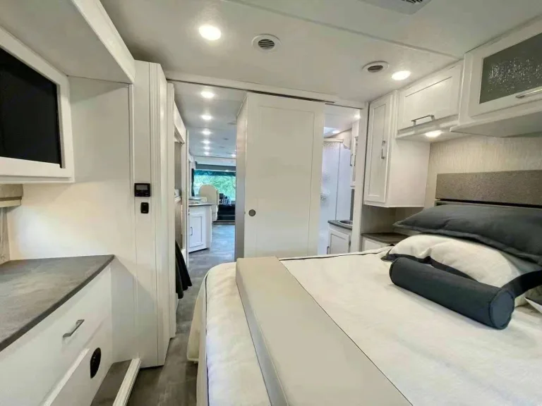 Modern RV rental interior with a bedroom, en-suite bathroom, and view to the front living area. Clean and functional design.. Coachmen Pursuit BH31 2023