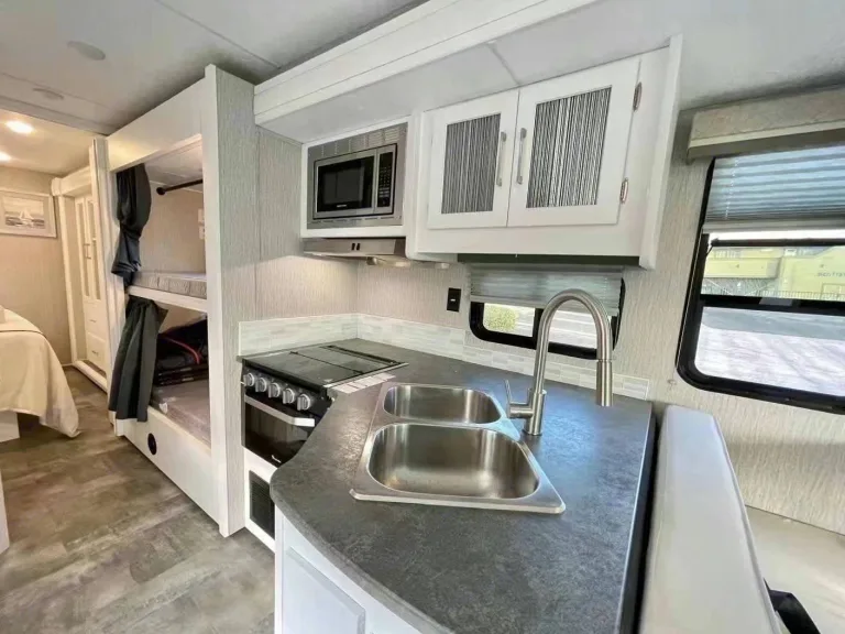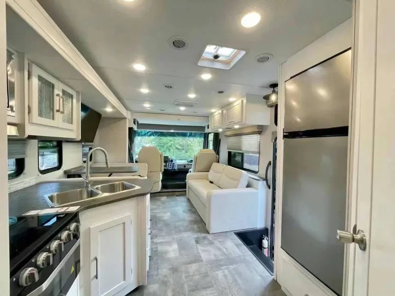 Clean RV rental interior featuring bunk beds, kitchen counter, and a spacious living area with sofa and captain's chairs.. Coachmen Pursuit BH31 2023