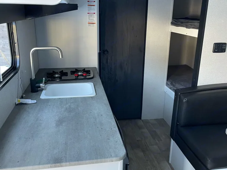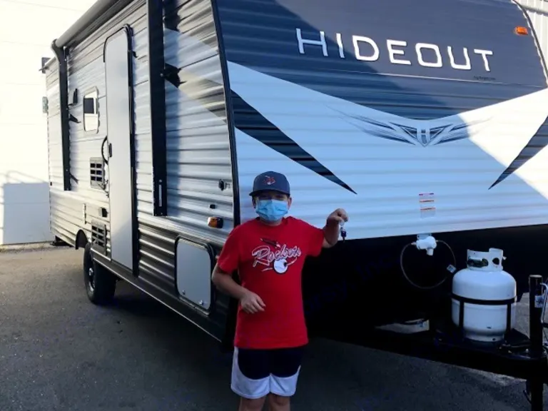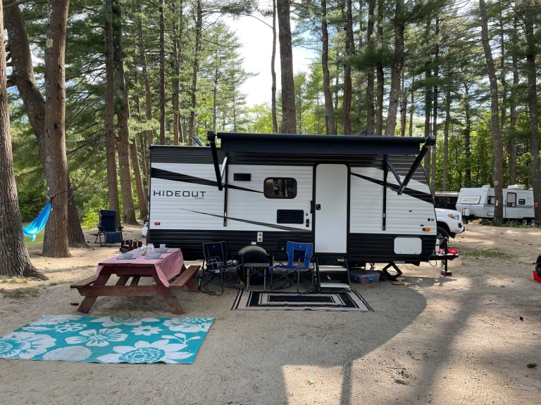 Our Hideout is ready to host your family for your week long vacation or quick weekend getaway! This easy to tow, brand new camper is perfect for couples, a group of friends and families. Featuring a queen size bed in the front and a set of bunk beds in the rear (30" x 74" - perfect for kids needing a cozy place to rest!). It also has a dinette that will convert into a bed, sleeping 1 adult or 2 kids. The kitchen has a sink, 2 burner stove, microwave and refrigerator. The kitchen comes fully stocked with cups, plates, knives, forks, spoons, kitchen/cooking utensils and some pots and pans. The bathroom in the rear has a sink, toilet and 38" walk in shower to wash up from a great day of camping!  Blackout night shades on windows for privacy and a great nights sleep and fresh linens are provided. The hideout is also equipped with heat and an Air Conditioner as well as storage for all your gear.Is it raining on your trip? Don't worry, the Hideout is stocked with board games and card games to keep you busy until the rain passes. Listen to your favorite music with the included Bluetooth capable radio.Outside our trailer comes with a waterproof mat, 4 camp chairs, exterior LED lighting, a 10' power awning and stabilization jacks which makes for a perfect place to enjoy a great campfire.The Hideaway also comes with a propane tank and all the hookup cables and hoses that you will need.Well behaved dogs are allowed upon approval (2 maximum) but please remember that not all dogs love camping and to please know your dog before you bring him/her along. A dog leash hookup is located right outside the front door so your pup can enjoy the outside right along with you. Please do not leave your pet unattended inside the camper. Pick up and drop off times Monday-Friday are at 6PM, weekend pick ups and drop offs can be more flexible. What's includedFresh linens, blankets, an assortment of board games/ card games, outdoor rug, 4X camp chairs, utensils, plastic plates, plastic cups, some pots and pans, coffee maker and 2 hammocks to set up at your campsite. Delivery and full set up and pickup within 30 mile radius upon request (outside 30 miles, please contact for options and pricing). If there is something you may need and you don't see it on this list, please ask...we may be able to locate it for you and help make your trip easier.RecommendationsMaine has so many wonderful campgrounds to choose from. Acadia National Park is one of our families favorite places to visit but there are also many great family campgrounds located in Southern Maine just a stones throw from the lakes and oceans! If you are looking for a specific region or recommendation, send me a message and I'd be glad to help you out. Other things to notePlease allow for 90 minutes at pick up for walk through and instructions. Pick up/drop off times are at 6PM on weeknights. If you are picking up/dropping off on the weekend times can be more flexible.We require that renters who will be towing this listing have the proper vehicle and towing experience. We are able to deliver and set up for you within a 30 mile radius of our home for an additional fee . If you need delivery outside a 30 mile radius we may be able to do that pending our schedule, please contact me for a quote.Well behaved dogs (2 maximum) welcome but remember no festivals, no smoking, and please no tailgating. Do not climb on the roof and please treat our camper as if it were your own.