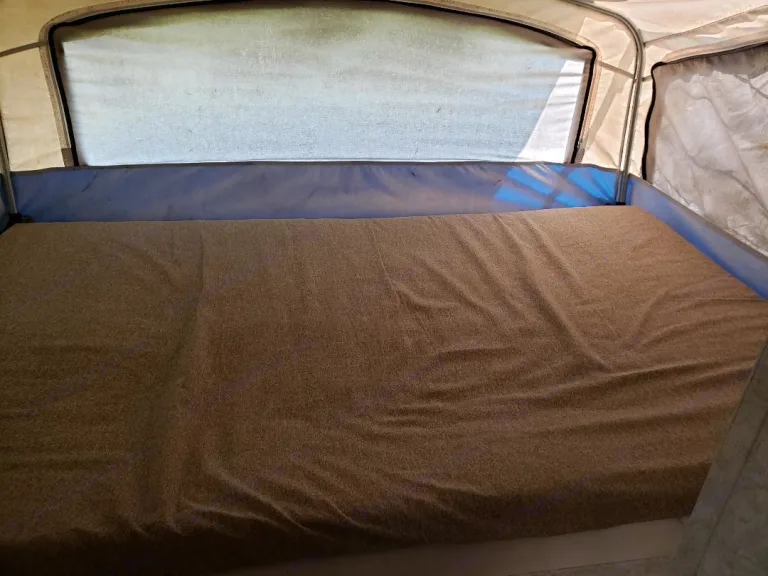 Three manual, simple setup pop outs and a fold down table sleeps 6-8 people ( one queen size and 2 double size popouts). Dinette also converts to a double.What's included