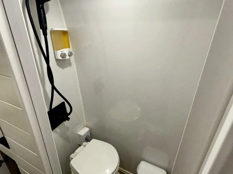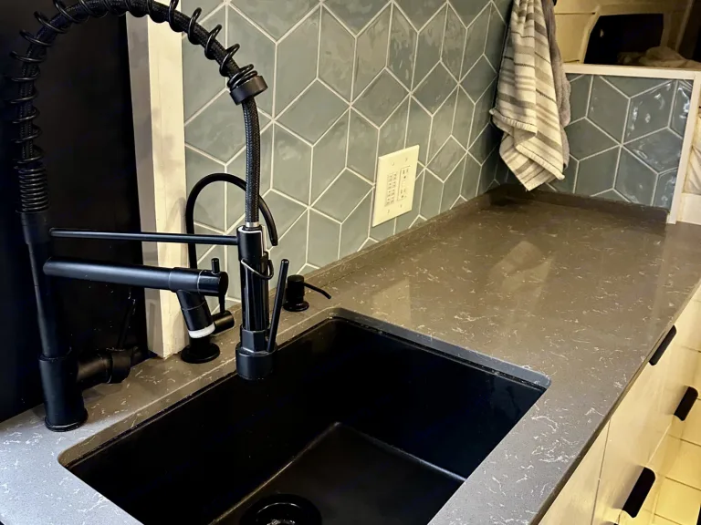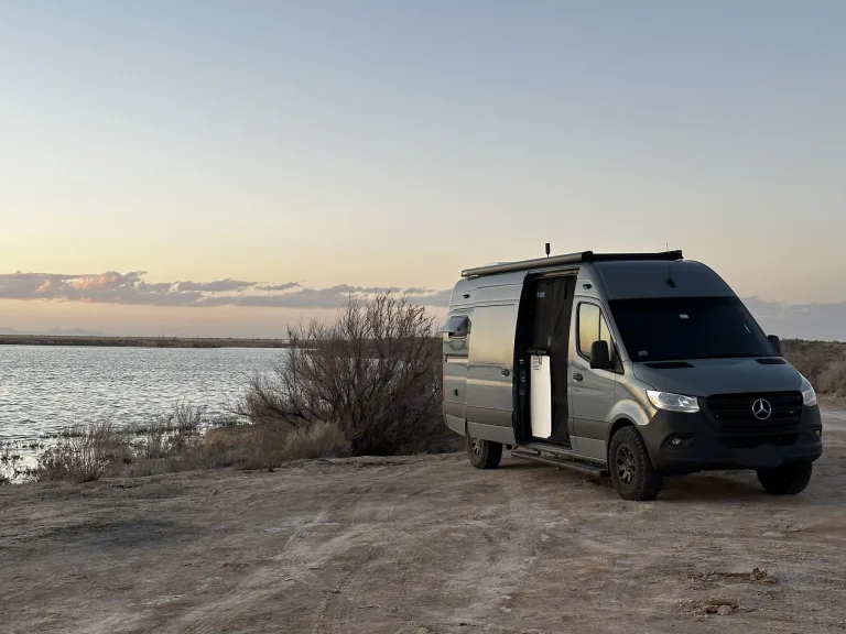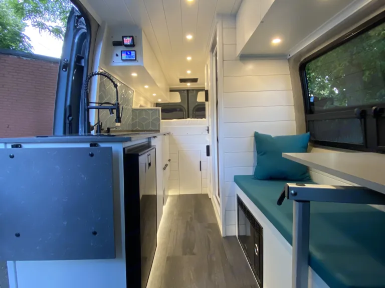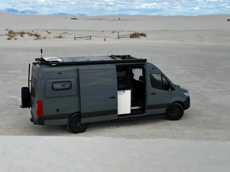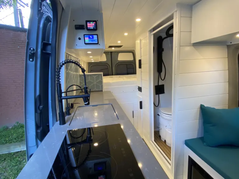 Ready to hit the road in comfort and style? This custom-built campervan is more than just a way to travel—it's your home on wheels, designed for adventure without compromise.With upgraded suspension and all-terrain tires, this van handles backroads and bumpy campgrounds with ease, giving you the confidence to go wherever your heart leads. Off-grid capability comes standard, thanks to a powerful 540 amp-hour lithium battery bank that fuels everything from the ceiling fan to the air conditioning unit mounted above the bed—yes, even your cool nights are battery-powered. The van comes equipped with a cell booster to improve cell signal in remote areas.Step inside and you’ll find a kitchen that rivals most apartments: quartz countertops, a stylish tile backsplash, and all the essentials including a 2-burner induction stove top, microwave, spacious fridge, and a deep sink for easy clean-up. Whether you're whipping up a quick breakfast or a gourmet dinner, you'll have everything you need right at your fingertips.Across from the kitchen is your own private wet bath—no campground restrooms required. With a composting toilet and a full shower, you can stay fresh and comfortable no matter how far you roam.The fixed bed features flares (bump-outs in the rear of the van), allowing you to sleep sideways and maximize interior space. Please note that this sleeping setup is most comfortable for two people under 6'1". Underneath the bed, there’s ample storage for your gear, making this van ideal for everything from weekend getaways to cross-country adventures.When it’s time to relax or share a meal, swivel the two front seats around to face the bench and the Lagun-mounted table—perfect for dining, working, or game nights. With seating for 3–4 adults while stationary, it’s a great setup for couples, friends, or solo travelers who like a little extra room. For clarification, there are only two seats with seatbelts.Large windows throughout flood the space with natural light by day, while dimmable puck lights create a cozy vibe at night. Whether you’re chasing sunsets, finding hidden campgrounds, or just enjoying the open road, this van is built to make every moment feel like home.What's included• 1 Sheet set, 2 pillows & comforter