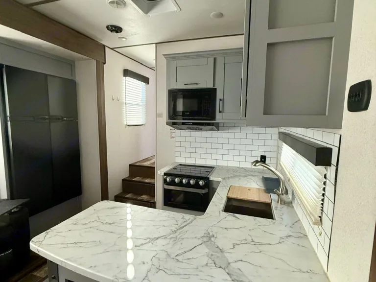 Adventure in style with this spacious 44-foot Keystone Fuzion Impact 415 toy hauler! This rig is the perfect mix of comfort and capability — built for families, groups, and outdoor enthusiasts who want all the comforts of home while traveling.Inside, you’ll find sleeping space for up to 7 people, including a private master suite, a 15-foot garage that converts into a second bedroom, and an extra loft bed for the kids or guests. The open living area features a large reclining sofa, TV and entertainment center, and a fully equipped kitchen with a residential fridge, stove, oven, and microwave.The garage area doubles as a versatile space — perfect for hauling ATVs, motorcycles, or just lounging once you arrive. The patio deck with railings adds extra outdoor living space, great for relaxing, grilling, or watching the sunset.Specs & Features: