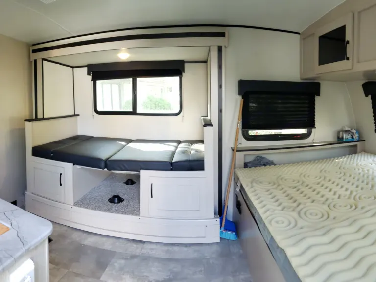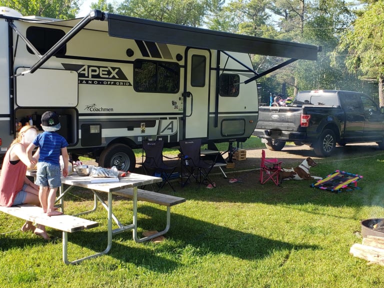 Our Nano is one season old and feels brand new when you walk into this easy to pull beautiful and fully equipped trailer. This model has a slide out dinette that converts into a comfy double bed. There is a queen sized bed at the front of the trailer with pockets for your books right at your head and USB jacks to charge your phone. There is a beautiful large window at the front of the trailer do you can wake up and look outside or watch the stars at night.There is a large sink with a wood cover for dishes making it easy to keep clean and have extra counter space next to a two burner stove. There is a large fridge and freezer that runs on either electrical or propane. With plenty of space for food for a family. There is a lot of room for food in a pantry and cupboard space for clothes. There is a bunk bed for two people at the back of the trailer next to the full bathroom with small tub if you have young children or washing your feet and a shower. Included is a water pressure regulator to make sure you don't flood the trailer but also have lots of power to wash off the dirt from a day of play.Outside there is a large awning with an outdoor kitchenette with a drink fridge and slide out cook stove and some counter space. There is also an outdoor shower/hose to wash the dogs or sand off you from the beach. The travel trailer has great heating for cooler nights and amazing A/C for those hot summer days. With lots of storage it can fit a week vacation for a family of four or five and the trailer being an extremely light trailer and lots of clearance it will go where you need to with your SUV.What's includedEach bed will come with a fitted sheet over it and an extra for the dinette if it is converted to a bed. There are dishes, utensils, pots, Cooking utensils, keurig maker, pans, cast iron griddle that can be used on the stove top or on the outside camp stove. The propane tanks will be full at pick-up. 2 adult camping chairs and 2 child camping chairs. RecommendationsIn this area we have Birds Hill Park which is great for kids and family with the paved paths for biking and hiking. The Whiteshell Provincial Park is also beautiful and a highly recommended location. This has everything from biking, boating, hiking and fishing. Our trailer has been very handy to take to visit friends and family with the size of it being able to fit in driveways. Its easy to pull and you forget you have it when on the highway. Other things to noteDogs are welcome but please no cats due to allergies. We love our trailer and hope you will too with the respect you can show it.