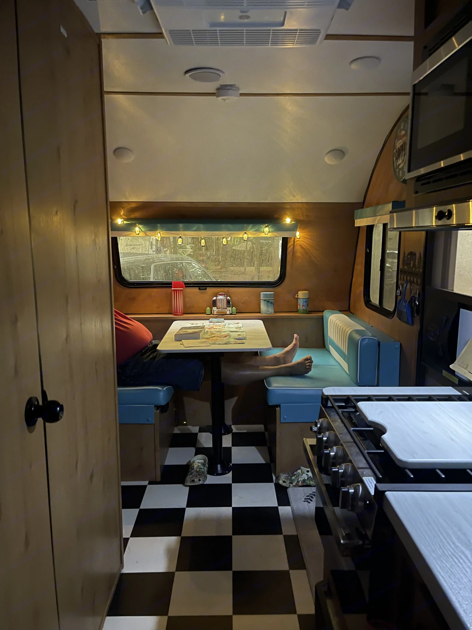 You are looking for Retro fun! So many memories to be made from this special camper. She is furnished with vintage style decor and has modern living comfort. You will enjoy the look and feel of an old diner when staying here. You will make your coffee in a cute keurig style coffee maker and drink from vintage cup and saucer or bring it in a thermos to go. The dinette feels just like a diner complete with a small wireless jukebox and vintage linens and silverware. You will sleep comfortably in any weather as Belle features a strong air conditioner/fan or heater as needed. She has indoor plumbing too! As you stay you will enjoy the indoor outdoor living with a large awning for picnic table or camping chair coverage, while you listen to the outdoor speakers. There is also an outdoor shower to rinse off those feet. The memories you make are unique and fun. Welcome!What's included. coffee maker with coffee pods