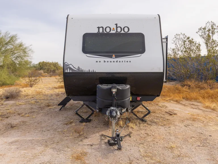 This rig is a 2023 No Boundaries 20.3 by Forest River. It’s 26’ long and boasts an 11’ interior with the dinette slide out. No power, no problem. The Unplugged Package on this unit is equipped with a 200W Solar Panel, a 2,000-watt inverter, and a 30A Charge Controller so you can truly get off-grid (experienced campers only for off-road use). Two 20-lb propane tanks are onboard with quick connection to the outdoor griddle.