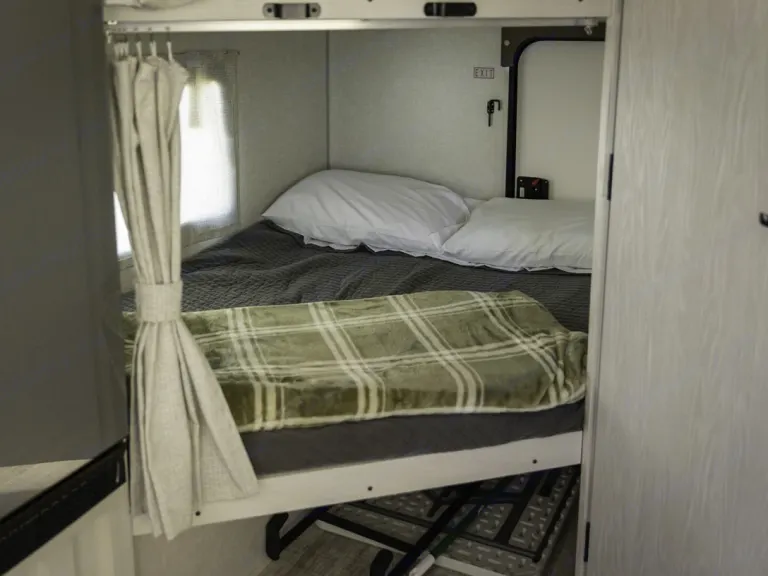 Get out and explore the Sonoran Desert & beyond with an unplugged package, bright interior, and spacious but compact living area. This is the perfect set-up for couples or a small family (if you have to). We love the outdoor kitchen for that full camping experience, cooking breakfast in the crisp, cool mornings and keeping that lingering bacon smell outside. This unit isn’t short on amenities though! Flip up the Queen-size Murphy bed to reveal a loveseat, enjoy movies on those rainy camp days, or relax after a long adventure. Tuck away the kids in the oversized bunks (rated 300 lbs each), or find extra storage for adventure bikes or other gear with a pass-through rear door. The bathroom may be small but boasts a shower with skylight, sink, medicine cabinet, mirror & storage.