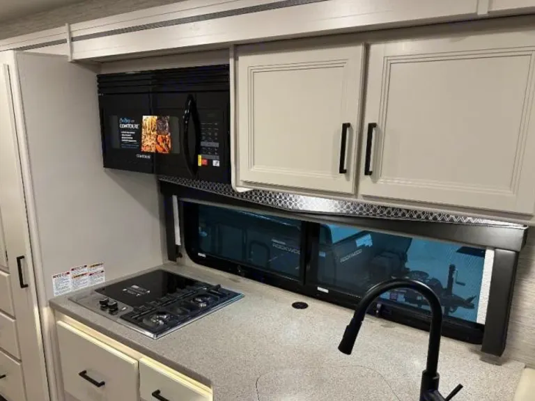 The full bathroom comes stocked with towels and TP - please only use provided TP. Outdoor shower is useful for rinsing off sandy feet or paws.We provide a kitchen stocked with basic cook-/bake- ware, kitchen essentials, & dining sets for 6. Coach has good sized fridge/freezer, gas and induction range, and microwave/convection oven. The dinette seats 4 comfortably.This coach will give you all the comforts of home with 30-amp electrical and water hookups as well as a built in generator. It includes 3 TVs, 2 inside the coach and one outside. The large power awning gives shade for those sunny days (Note: that use of awning requires a larger security deposit.) Pets are welcome, but subject to approval and additional security deposit. We do require the interior insurance and security deposit for all bookings. Absolutely NO Smoking Inside THE Coach. There will be a $500 penalty for this.This coach has many features that make it easy to drive, including 3 exterior cameras to support the driver. There are 5 seat belts in the coach, including two Latch compatible seats for our smallest campers. Apple Car Play and Android Auto are included. We recommend RV specific navigation system for additional safety on the road. This RV needs a 12' clearance.Our prep fee ensures you have a clean, sanitized coach ready to go at pick-up. If we must spend more than an hour cleaning the interior, we’ll take a portion of your deposit for that. Cleaning supplies are provided for your convenience.What's includedWe provide the basics, you provide the extras and fun! Included: