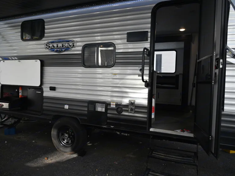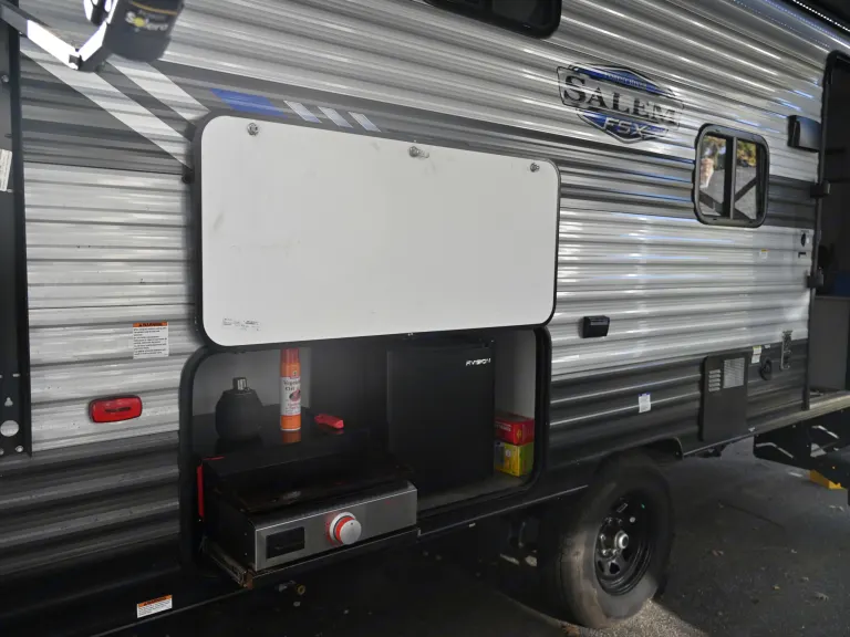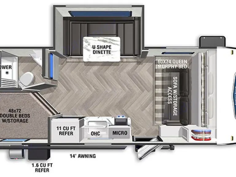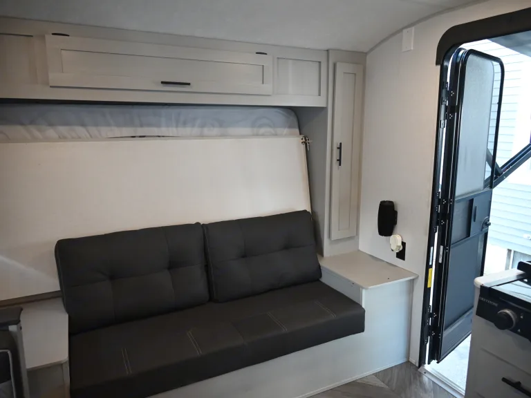 Thanks for viewing our listing, this is a much-loved family-friendly RV that has plenty of space for a small family as well as a couple and a few fur babies with the convenience of towing a smaller camper! Love this camper, it's easy to back in and has everything you need!Bring your whole crew along for trips in this roomy travel trailer that can sleep up to 7 people each night. Once you've set up the 14' power awning with LED lights, make lunch on the outdoor propane griddle, and there is an outdoor refrigerator for cold drinks. Explore some trails or take your fishing poles down to the river, then head back to the trailer to clean up in the full bath. The kids may want to rest on the double-size bunks, while the adults play a game around the U-shaped dinette. This model also includes a sofa with storage access, plus a Murphy bed that lowers over the sofa when you're ready for bed.Sleeping arrangements: