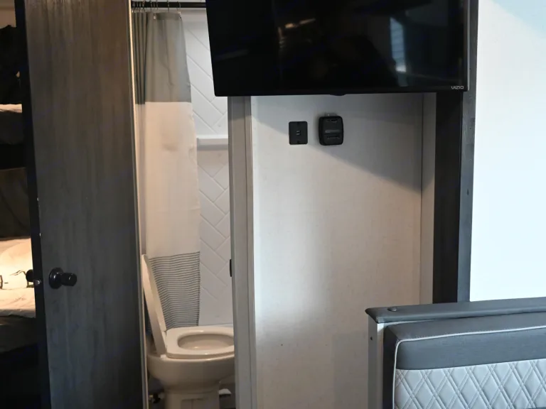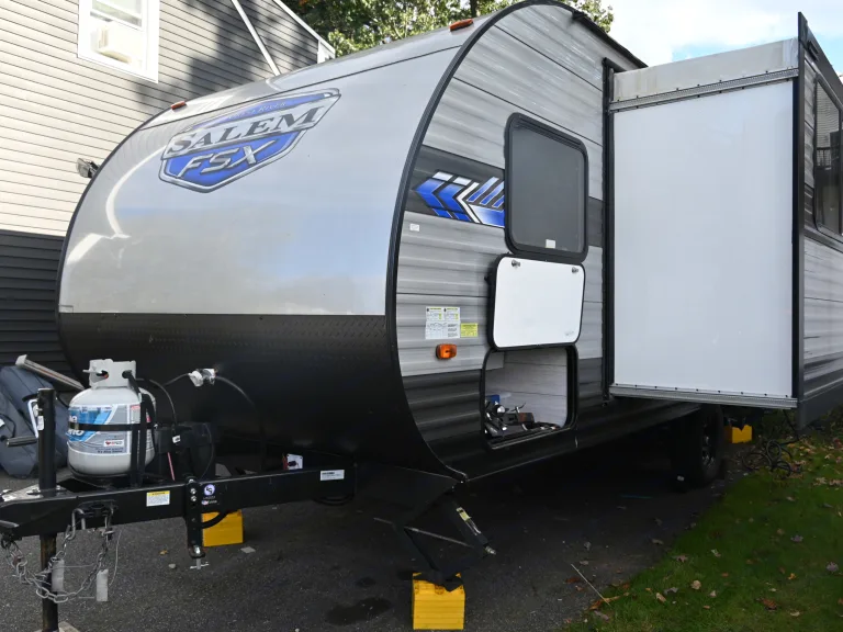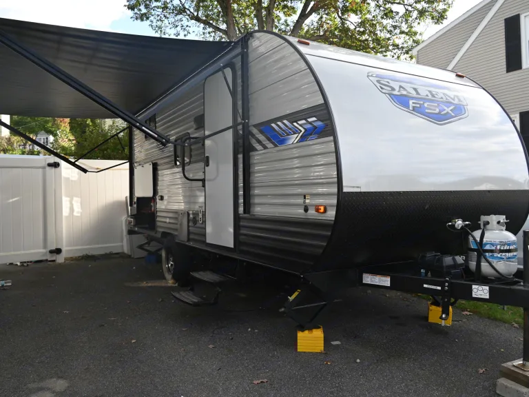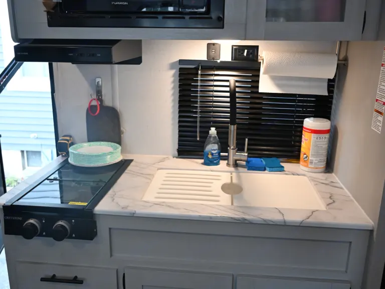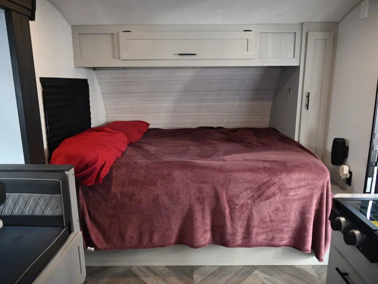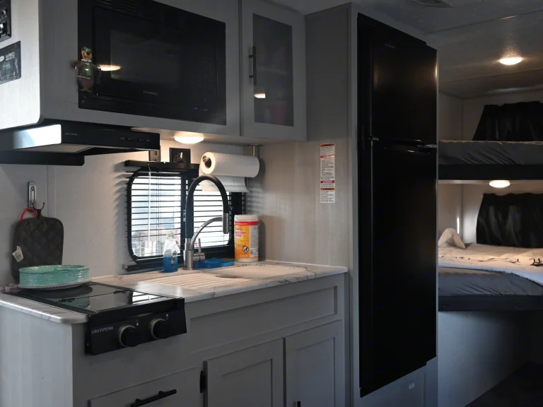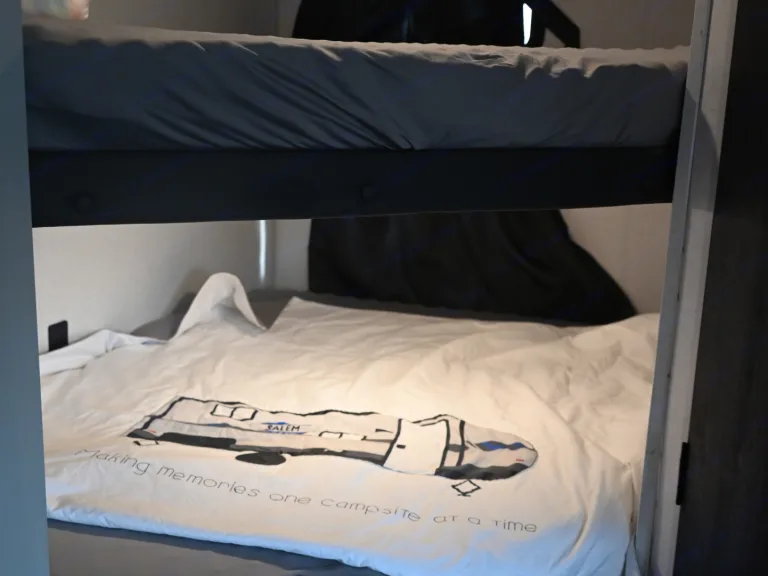 * The table also converts to a full-size bed. There is a mattress topper for this located in the cabinet.I can deliver it to the campground for a fee which includes setup and breakdown of the camper. Just meet me at the campground and I will hook everything up for you and when you are ready to leave just text me and I will meet you at the campground and unhook everything! Just make sure you sweep clean the camper before I arrive.There is a cleaning fee, but if you clean the camper and leave as you found it then we are happy to refund you the fee.What's includedWe have sway control and a heavy-duty hitch for you to use, a 37" Smart TV that is wall-mounted, or feel free to bring it outside and watch the game! All the wiring and hookups you need for any campground! We have extension chords, coax cable for tv, toilet paper, paper towels, paper plates, pots, pants, silverware, basic spices, knives, cookware, coffee maker, microwave, toaster, outdoor griddle! Tons of usb plugs, including 2 plugs in each bunk!
