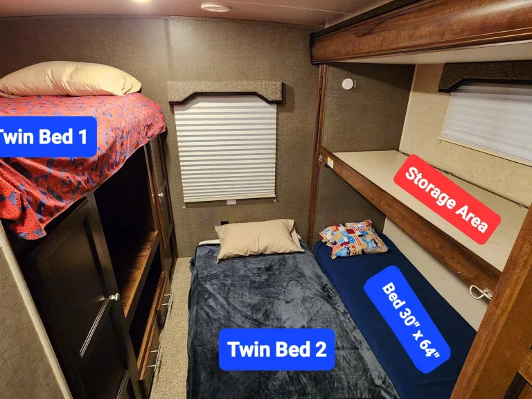 - Sleeps up to 6 adults comfortably or up to 8 with kids with a queen-size master bed, 2 twin size beds, one short twin bed, a convertible dinette area, and a pullout sofa. For your convenience, we provide fresh bedding (sheets, blankets, pillows) and bath towels.